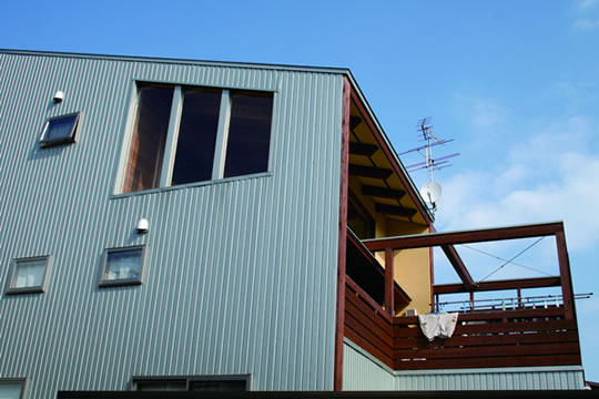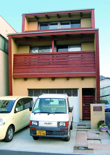 間口3間で南北に細長い敷地に、述べ床面積60坪の3階建ての2世帯住宅を計画したが、