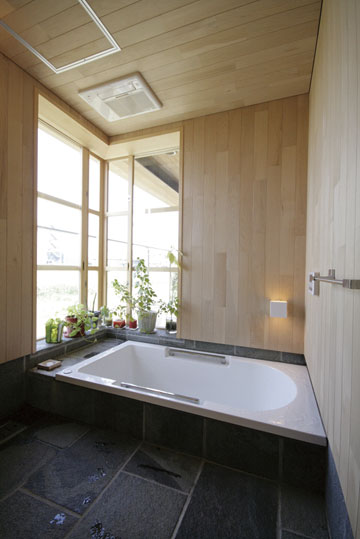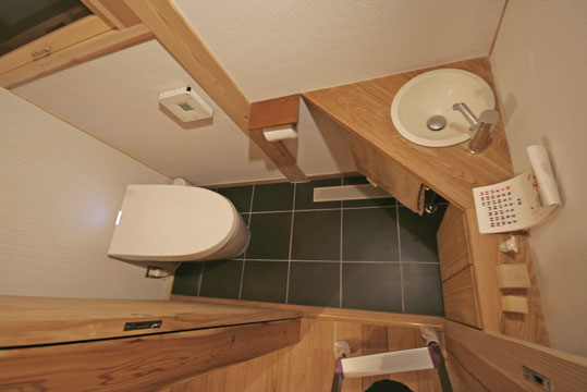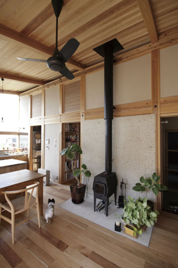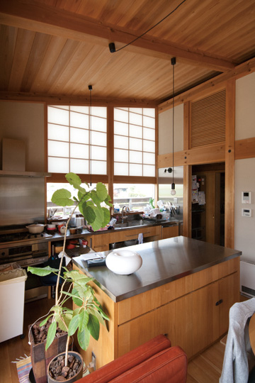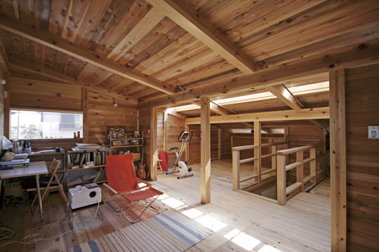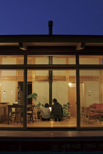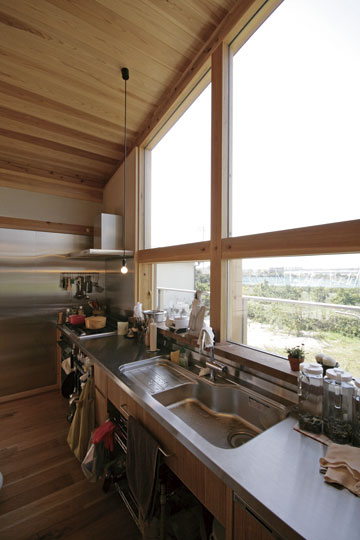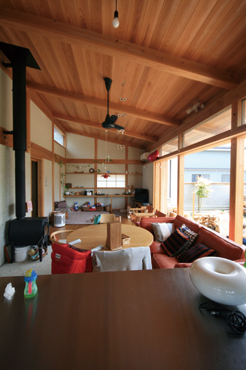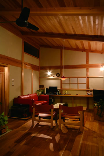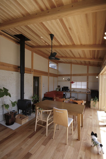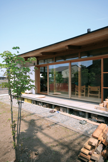 『ひとつの家』と名づけたこの家は、一枚の大きな屋根の中に平屋的な生活を主体として計画されました。大きなひとつの屋根の中で、家族がひとつに暮らす。そんな意味合いを『ひとつの家』の名前に込めています。私の友人でもあり、建築の仕事に携わっている施主のS・Yさんとの共同作業で設計が進み、平成20年11月に無事完成することが出来ました。『ひとつの家』は、1階の生活スペース21坪+2階のロフトスペース12坪+2台分の車庫7坪の、延べ40坪で構成されています。Sさんご夫婦は空間や素材に対する意識が高く、細部まで時間を掛けて図面や材料を吟味していきました。