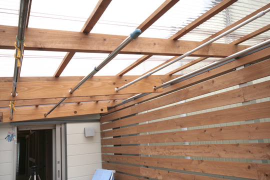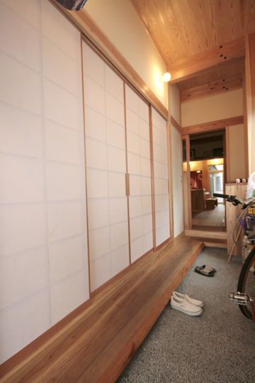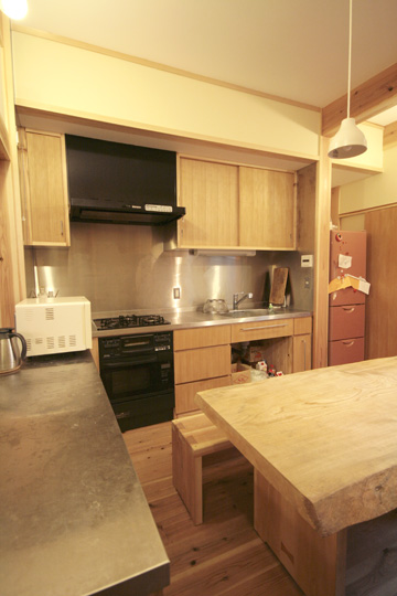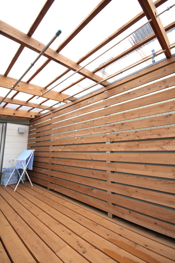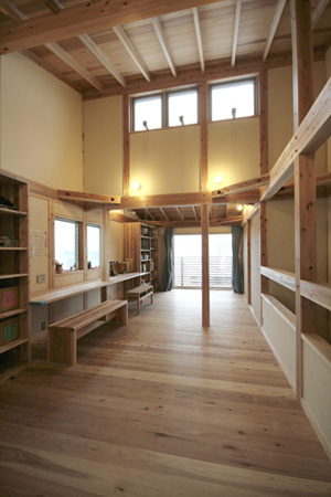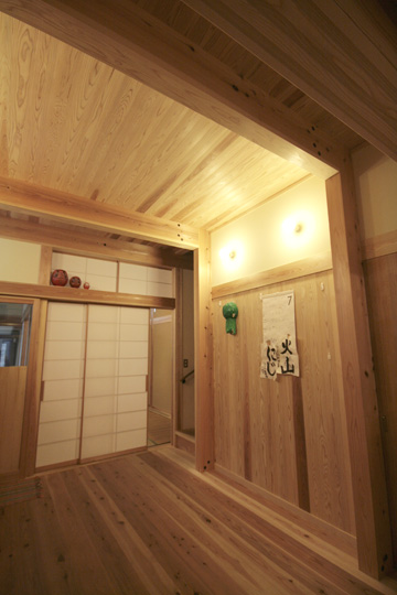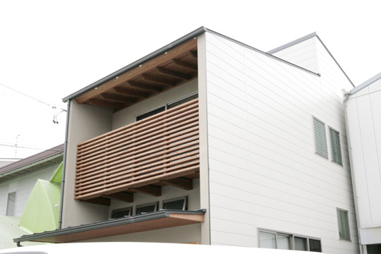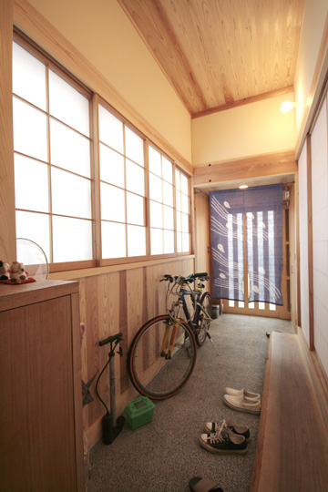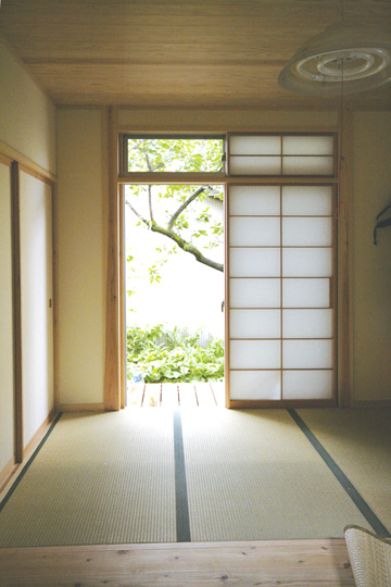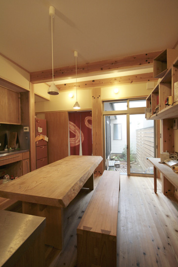 『田町の町屋』は、敷地間口4.5m×奥行き31mの敷地条件の中で、家族7人で共に暮らす家の建替えを計画し、平成21年3月に無事完成することが出来ました。夫婦+お子さん+お母さんとの共同生活を盛り込んだ計画と言う事で、町屋などに見られる中庭を取り入れ、生活スペースを2つに分けたプランとしました。中庭を設ける事で採光と通風を期待しつつ、お母さんのスペースとの程よい距離を保っています。また、中庭に面したスペースに、渡り廊下と共有の水廻りを配置し、お互い気兼ねなく暮らせる為の配置としました。また、敷地条件に合った構造や施工、材料に制限の掛かる「準防火地域」など、様々な規制の多くあった家造りでしたが、あきらめない家造りから彩のある家が出来ました。
