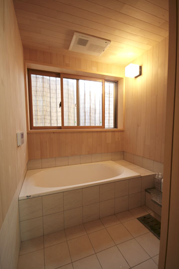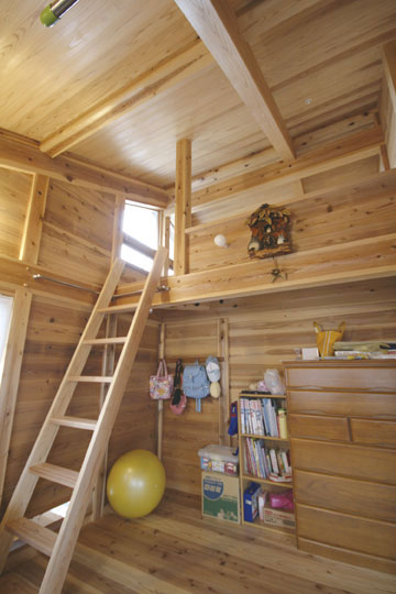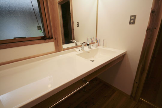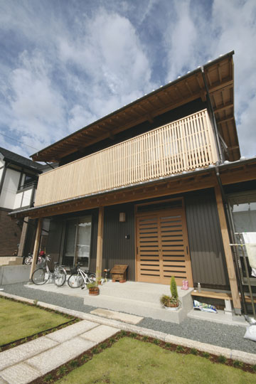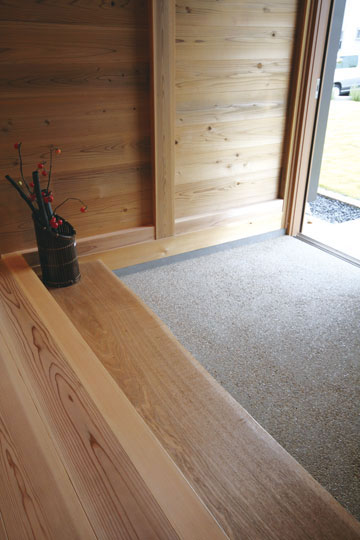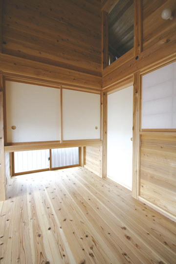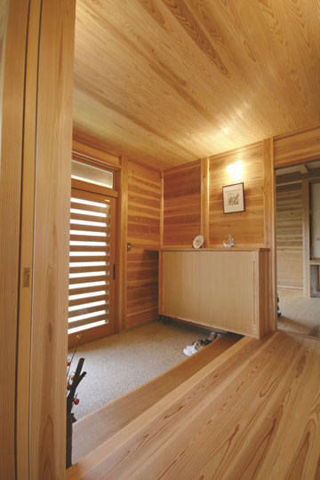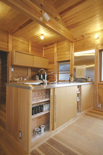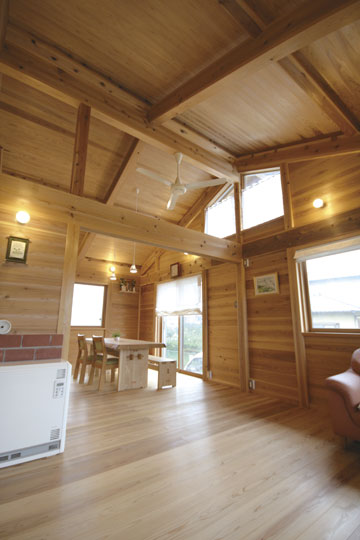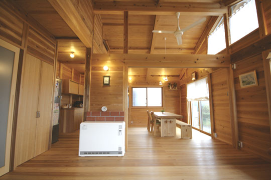 『丘陵地の家』は緩やかな傾斜地を造成した場所に建築しました。日本瓦の落ち着いた外観で、内部も落とし板の杉板を全面的に現した室内となりました。全体的に飾らない雰囲気の中、蓄熱暖房機やシーリングファン、防露サッシを採用し、無理なく心地よく住む事を考えた家になったと思います。