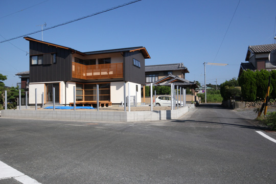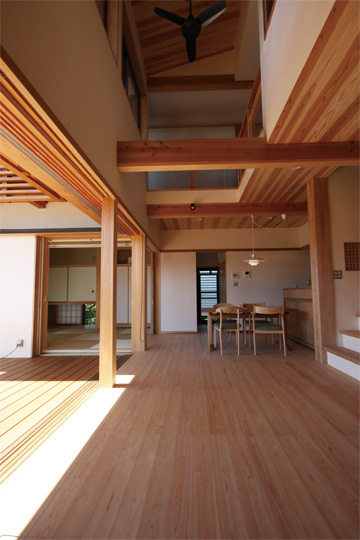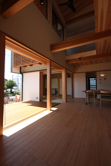 “朝日の家”と題した今回のお宅は、朝日の昇る、東南を囲い込むように建っています。この形は朝日を取り込む目的と同時に、遠州地域特有の、冬の西風避けの目的も果たし、デッキ部分に心地よい陽だまりの空間を作り出しています。
