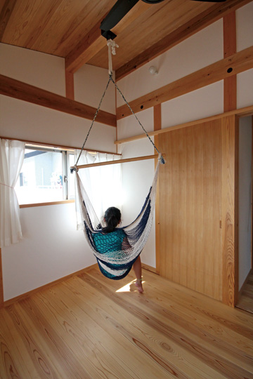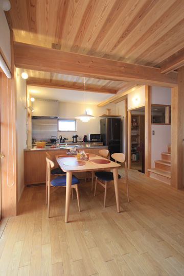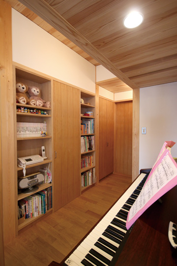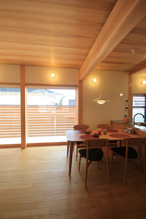 慣れ親しんだ地域に新しく土地を求め、昨年の12月に移り住んだYさんご家族。『風音の家』と題したこのお宅には、風が心地よく通る広間や開放的で伸び伸びと動きやすいキッチン、娘さんが頑張っているピアノのスペースにYさんのご趣味である熱帯魚を飼育する水槽室を設けるなど、家族みんなの希望をカタチにした心地よい木の家になりました。