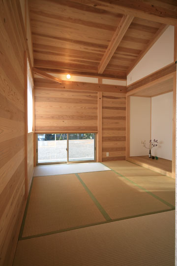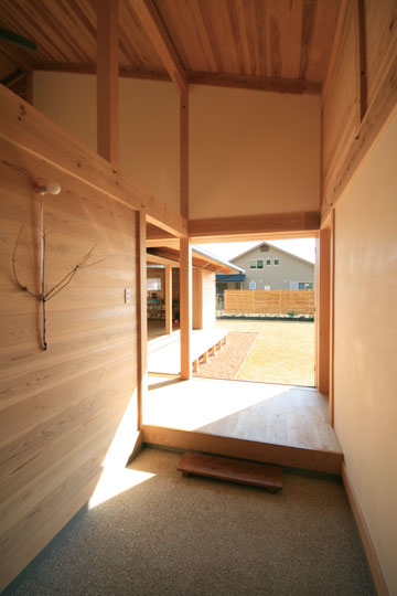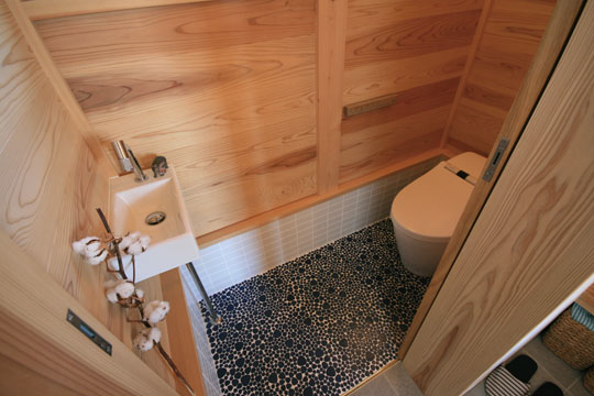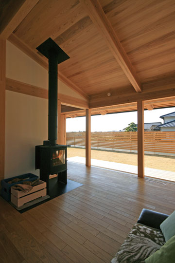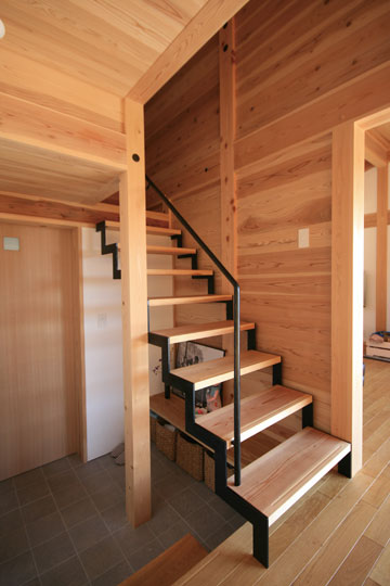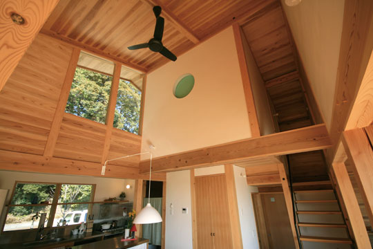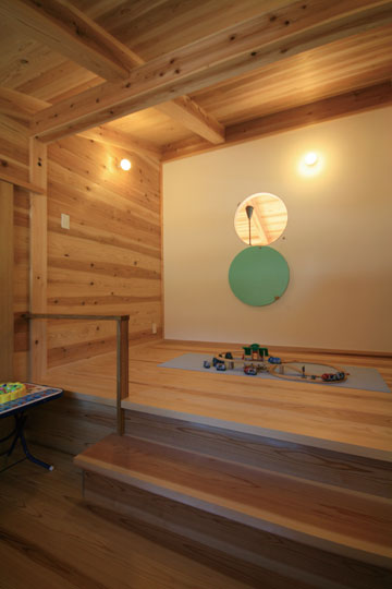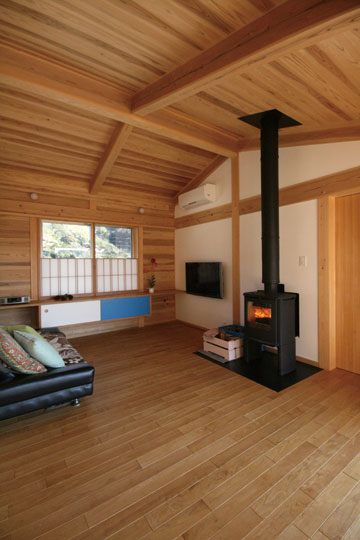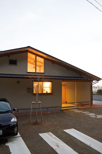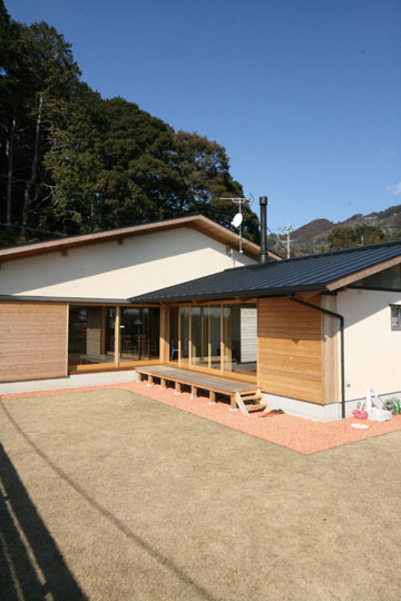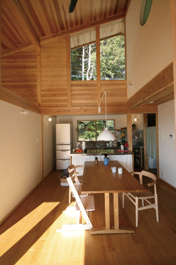 今回の建築地は田んぼと山に囲まれとても恵まれた静かな場所。この敷地を活かし平屋的なのびのびとしたプランを計画し、自然と一体となった家づくりを行いました。ココラボ定番の板壁構法(板倉構法)で作られた『雫の家』は構造をそのまま現した合理的な住まいですが、庭に大きく解放したL字型のガラス窓や浴室などの水廻りの工夫。そして、所々にオリジナリティーを加えNさんの好みでアレンジした空間となりました。 家族構成/家族3人 屋根/ガルバリウム鋼板 タテハゼ葺き 設計者/山崎健治 |