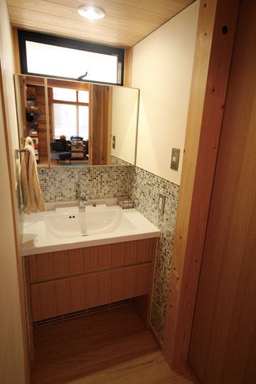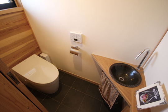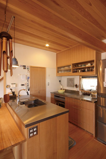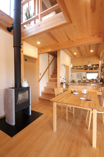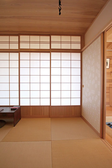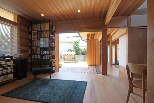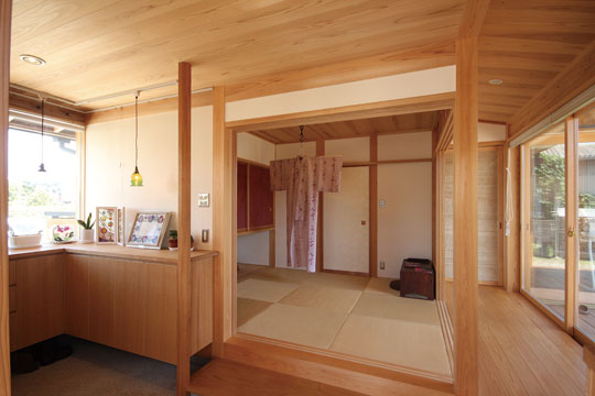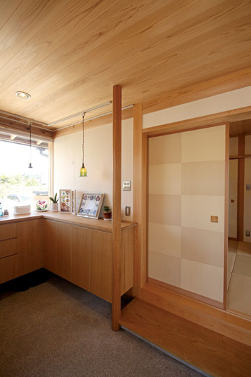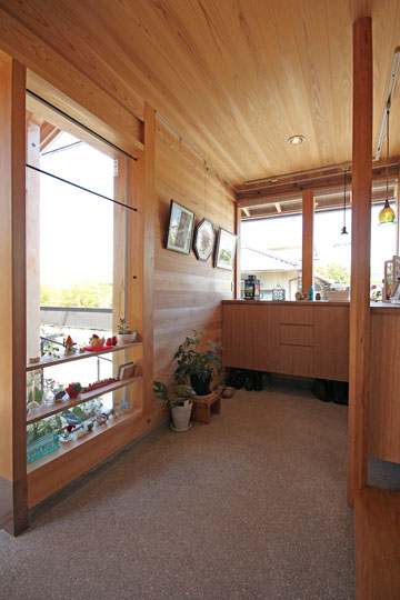 昨年の1月に完成した、静岡市『器の家』。数年前から家づくりの相談をいただいていましたが、計画道路との関係もあり一昨年から具体的な設計がスタートしました。今まで住んでいた家は広く、それぞれの部屋もあったけど、子供たちも成長し、これからは自分たちの時間を楽しもうと考え、木に包まれた板倉の家をベースに、小さなギャラリーのある住まいを計画しました。それぞれに趣味を持たれているOさんご夫婦。奥様はアート作品づくりや着物を楽しんだり、ご主人は音楽や懐かしのグッズを集めたりと、それぞれが多趣味なお二人。自らが製作した押し花アートやグラスアート、ご友人の作品なども展示する場や着物の着付けをするための和室なども取り入れ、生活と趣味の時間が混在する楽しい木の住まいができました。