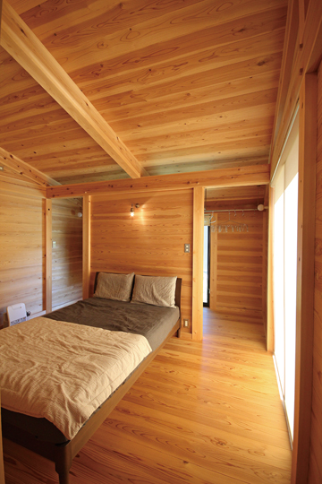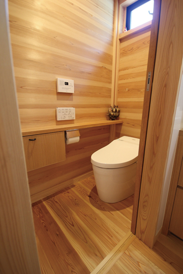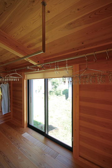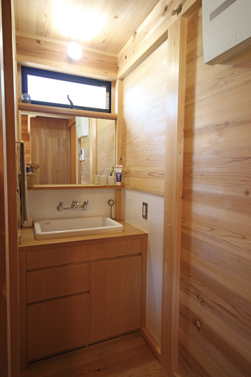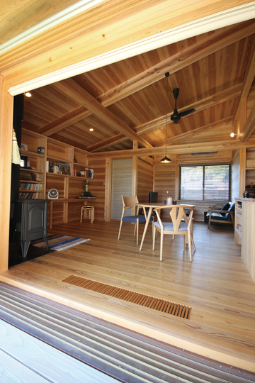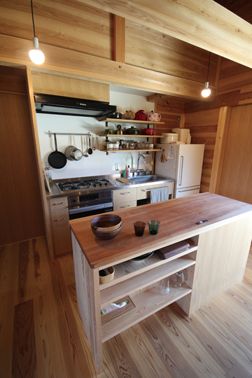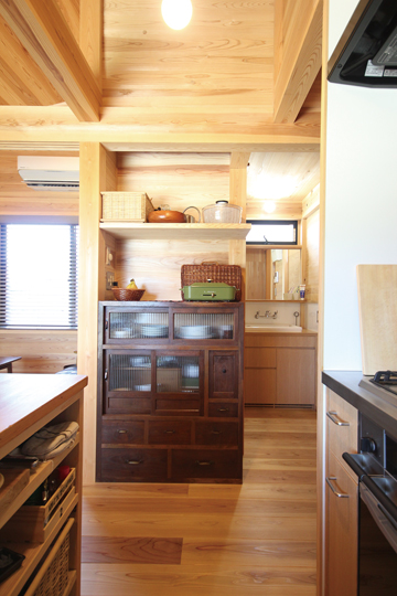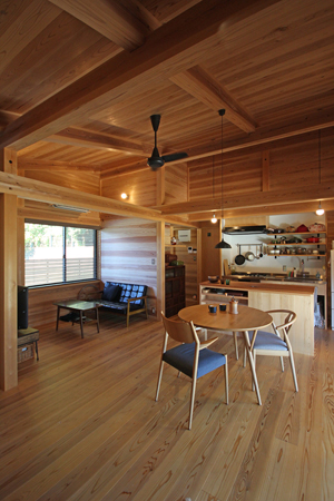 Oさんの住まいは18・5坪の平屋のお宅です。通常のお宅と比べると小さな住まいですが、平屋というのがポイントで、横と縦に空間が広がり、伸び伸びとした印象の住まいになりました。室内の物干しスペースを確保し、水周りや収納スペースの動線も考えられた機能的なプランになっています。また、奥さんのおばあちゃんが裁縫などに使っていたという、一枚のカウンター材をキッチンの作業台につくり変えるなど、思い出の物を家づくりの中に加えた事が印象に残りました。お気に入りの家と物に包まれた暮らしの中でお二人の世界観を広げ、木の家と共に楽しく歩んでいって欲しいと思います。