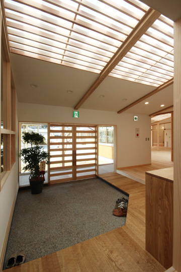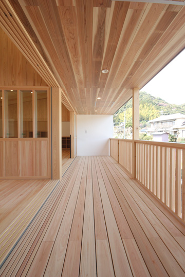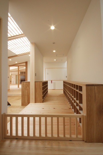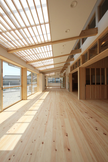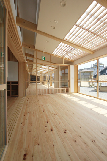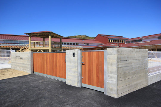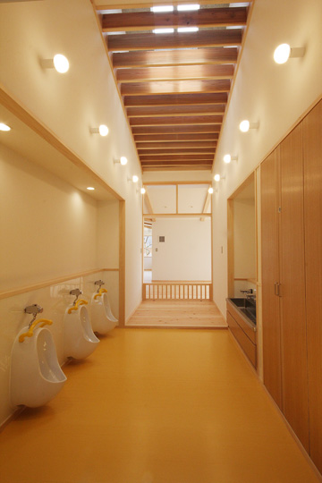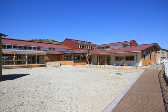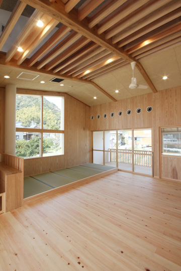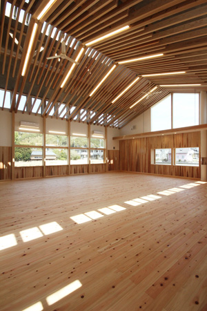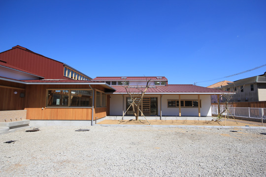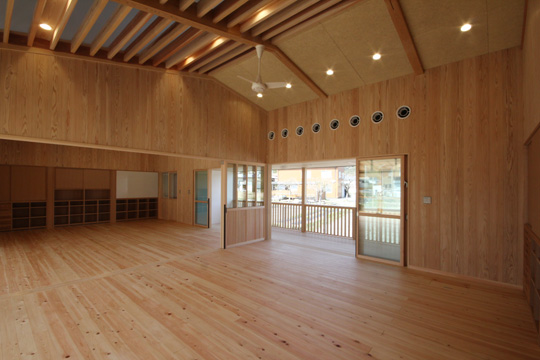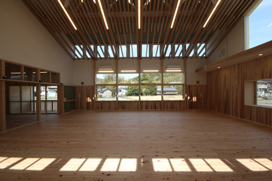 今年の春、島田市に新しい木の保育園が誕生しました。元々同地域にあった保育園の園庭が土砂災害の警戒区域に指定された事と、建物の老朽化や耐震性等の問題が重なり、今回の場所への移転として新しく計画されました。いろいろな問題はあったものの、旧園舎の周辺には小高い山や木々、田んぼなどが広がり、自然と一体となった遊びや体験を軸とした保育が評判の保育園でした。私たちが提案した園舎は“保育理念=園舎づくり”をテーマに、周辺環境が変わっても、旧園舎での思い出や取り組んできた保育を活かせる園舎をつくりたいと考え、リズム体操が出来る広い遊戯室を確保し、保育室などから周辺の山々が見渡せ、園舎と園庭が一体となったプランを提案しました。合わせて、地域の木材をふんだんに使い、仕上げにも木を現した保育園とし、優しく暖かく、そして地域の自然を身近に感じられる内部空間としました。 |
