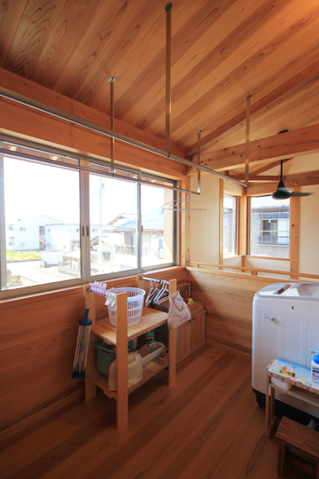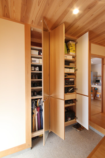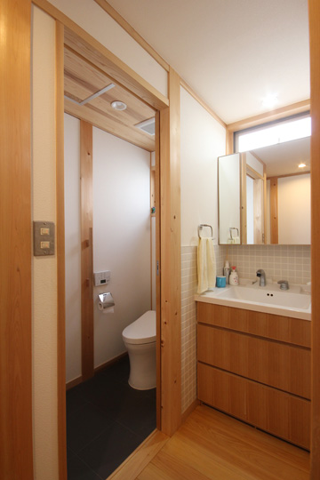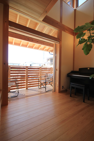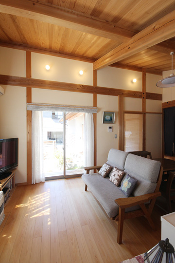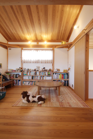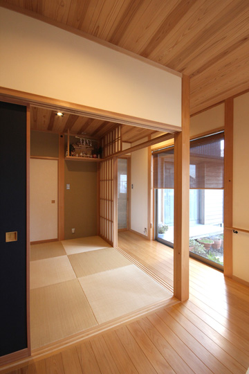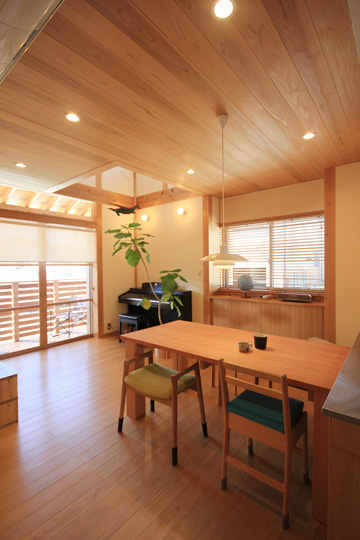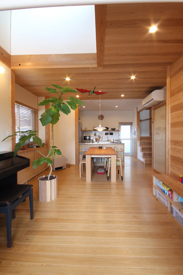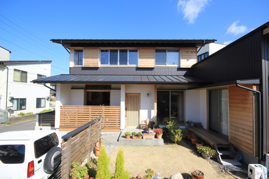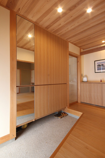 静岡市の新しい中心地として人気の東静岡エリア、駅の近くはマンションや様々な商業施設が建ち賑やかな場所ですが、駅から少し離れたKさんご家族の暮らす地域はとても静かな場所で、自然が多く残り、ゆったりとした雰囲気を感じる住宅地です。 二世帯住宅というと、1階が親世帯で2階が子世帯、玄関や水廻りが2つある家などを思い浮かべる人も多いと思いますが、二世帯住宅といってもその形は実に様々。今回Kさん家族の形は、玄関、客間、浴室を共有し、リビング、キッチンを別々とした間取りとしました。敷地にゆとりがあったので、1階に親世帯と子世帯のリビング+キッチンを配置し、玄関と客間が共有スペースとなっているのが特徴です。