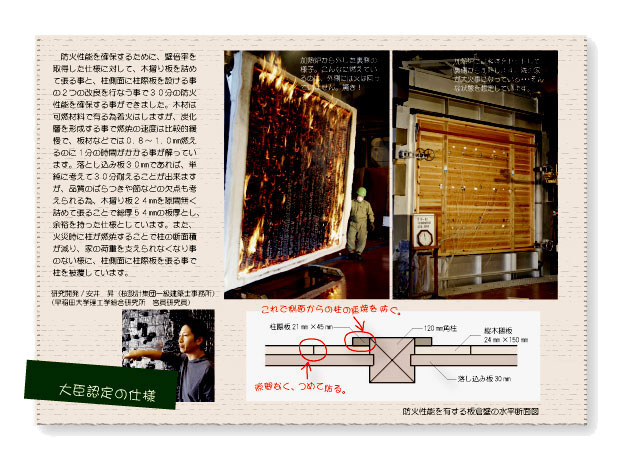 現建築基準法では、外壁に一定以上の防火性能を持たせる為に、外壁の室内側に、石膏ボード貼やグラスウールなどの断熱材の充填が決められていますが、今回の認定仕様を採用すれば、その様な仕様としなくても、場所を選ばず、杉の落とし込み板を室内に現した仕様とする事が出来ます。木自体は燃える材料ではありますが、木の使い方、特に木を厚く使うという事が大きな効果を顕し、火災に対しても十分な性能を発揮しています。