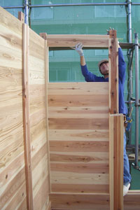 壁倍率の大臣認定を取得した板倉壁の仕様も元に、外壁の防火構造の開発が行われ、2007年5月に大臣認定を取得する事に成功しました。これにより準防火地域の2階建てや、法22条区域の2階・3階建てに対しても、外壁を板倉構法で施工する事が可能となりました。