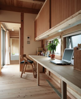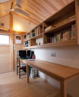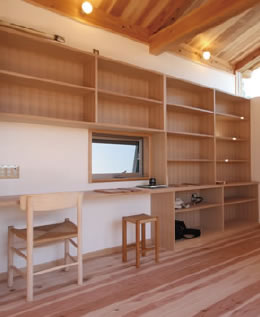 家づくりの要望の中で意外と多いのが本棚。本棚と言っても書斎や子供室で使う個人の本棚ではなく、リビングや廊下の一部などにあって、家族みんなが共有して使える本棚を希望する方が多いようです。要望を細かく伺うと使い方は様々で、雑誌や文庫本を収納するだけでなく、お子さんの絵本を置いたりおもちゃの収納場所に使いたいとか、オーディオやCD置き場に使いたいと言う方もいます。また、本棚の近くにパソコンを置いたり、ちょっとした書き物ができるカウンターが欲しいと希望される方も多く、リビングや廊下の一角に本棚とカウンターを組み合わせた書斎コーナーを設ける事もしばしばあります。
