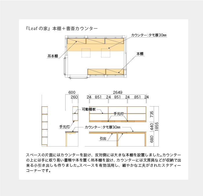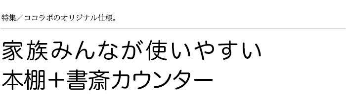 ココラボで作る本棚はステンレスダボを設け可動式の棚板とし、棚板の上下には微調整できるダボ穴を余分に設けて細かな寸法の変化にも対応できるようにしています。また、本棚とカウンターを組み合わせ、間取りや用途、使い勝手に合せて様々なパターンを作っています。今回ご紹介する本棚や書斎カウンターはごく一部の使い方だと思いますが、ちょっとしたアイデアとして参考にしてください。