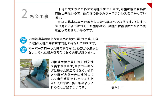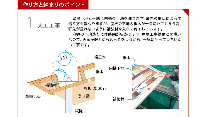 そして軒樋自体を隠してしまう"内樋"という手法を用いる事で、すっきりと綺麗な軒先を造る事ができます。