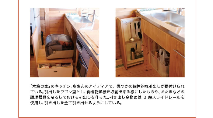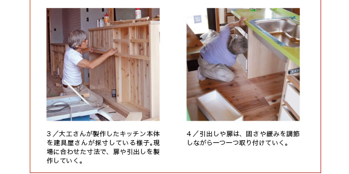 板の反りの影響を最小限に押えています。また、引出の中身の材料や金物にもこだわり、水の影響を受ける引出は耐水性の板を使用し、