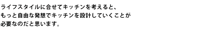 もっと自由な発想でキッチンを設計していくことが必要なのだと思います。また、キッチン細部の寸法や使い方、扉や引き出しの中身の材料までこだわっていくことも可能なので、