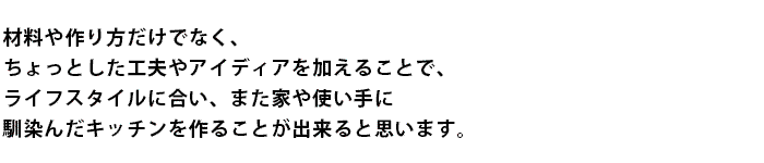 ちょっとした工夫やアイディアを加えることで、ライフスタイルに合い、また家や使い手に馴染んだキッチンを作ることが出来ると思います。
