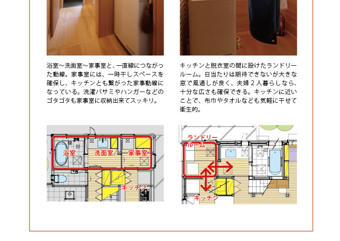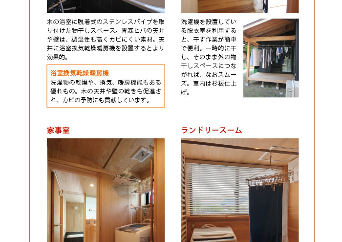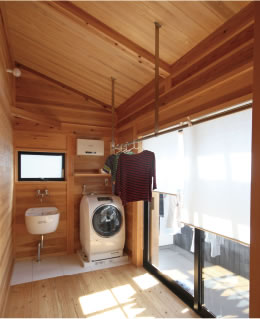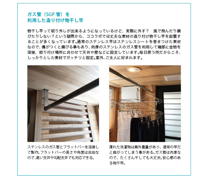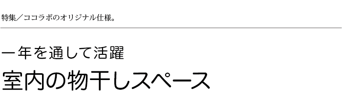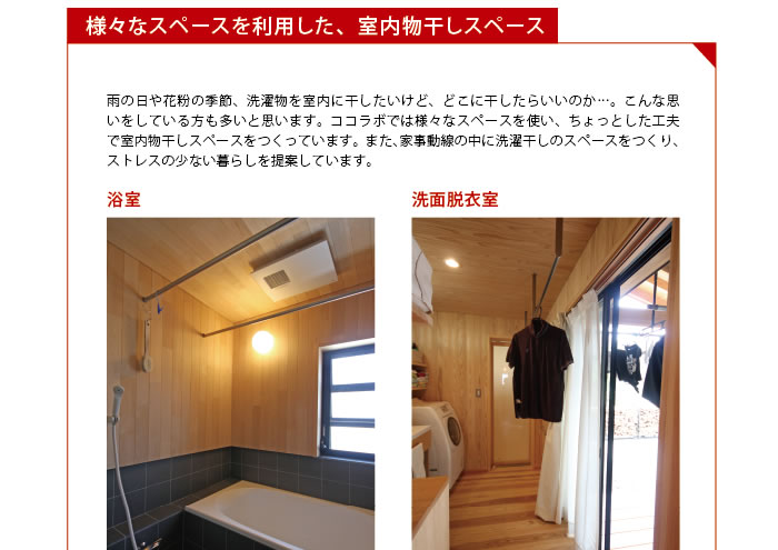室内の物干しスペースを考えると、いくつかクリアしていかなくてはいけない事があります。まず始めに考える事は、物干しに見合った広さが確保されているか? 洗濯物は、意外と広いスペースが必要で、干しやすい幅や長さもあります。服と服が重ならないように、また洗濯物それぞれの干し方など、ストレスなく干すには、様々な工夫も必要になります。広さに加え、風通しが良い事も重要です。日差しが当たる事も大切ですが、一年を通して考えると日差しより風通しが重要で、日陰でも十分に乾いてしまう事もあります。さらに最も大切なのは、壁や天井の素材にあると思います。洗濯物が乾くという事は、水分が蒸発するという事。その水分の出口を考えておかないと生乾きになったり、室内のカビの原因にもなります。ココラボでは、水周りや物干しスペースの天井や壁には積極的に調湿性の高いスギやヒノキ、ヒバなどを使って仕上げています。サンルームなどの専用なスペースが確保出来ない場合は、浴室や脱衣室、ホールなどを使ってスペースを確保したり、また物干し金物も一工夫して製作しています。次ページでは、様々に工夫をされたお宅を参考に、物干しスペースの事例を紹介したいと思います。