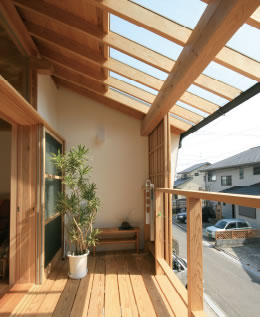 「ベランダに深い軒を作り物干スペースとして利用したい」とか、「ウッドデッキの上に屋根を設けて、雨に濡れない外部空間を作りたい」などの要望に応え、生活を豊かにしてくれる明るい屋根が出来上がっています。
