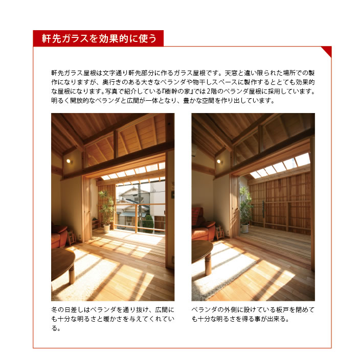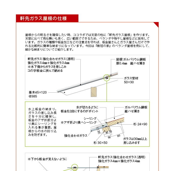 軒はどの位の長さがあればいいですか?と質問される事があります。雨や日差しを遮るのであれば長い事に越した事はなく、ベランダ等の木部を守るという面でも深い軒は有効ですが、あまりに長いと逆に室内が暗くなったり、冬の日差しが室内に入らず寒い家になってしまう事もあります。ココラボでは、深い軒を作りつつ明るく暖かい家を作る工夫として、軒先の一部をガラスで作る納まりを考えて実践しています。