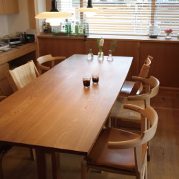 オーダー家具で製作する事が多いのはダイニングテーブルです。部屋の大きさや使う人数に合せたり、手持ちの椅子に合せて高さを調整したり、一部に引出しを設けたりと…。ココラボのお施主さんの中にはダイニングテーブルにこだわりを持つ方も多く、素材や形を吟味し、使い勝手などに合せて色々なテーブルが生まれています。オーダー家具は、素材からサイズ、細かな工夫まで可能性は無限大ですが、希望に合せて無理矢理つくるのではなく、木の事を熟知した家具職人の意見を聞き、素材や用途に合せてつくる事をお勧めします。 家づくりと合せて建具屋さんや大工さんに家具製作をお願いする事もあります。家に直接取り付ける造作家具と呼ばれる家具は主にこの職人さんたちにお願いしていますが、テーブルや机、ベンチなども合せてお願いするケースもあります。同じテーブルでもつくり方を見ていると様々で、建具屋さんはホゾと呼ばれる組み手を作り接合部を組んでいくのに対し、大工はダイナミックな木組みでテーブルを組んでいきます。当然でき上がりの雰囲気が変わってくるので、家のイメージやお施主さんの好みに合せてデザインを変えて作っています。 |