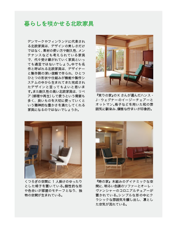 新生活がスタートすると一番に必要になるのがテーブルや椅子などの身近な家具ですが、意外と家づくりの中で後回しになってしまうのも家具などをはじめとするインテリアです。完成間近になって慌ててショップ廻りをしたり、インターネットやカタログなどで急いで購入されている方もいるのではないでしょうか。ですが、家具も家と同様に様々なスタイルや製造方法があり、デザイナーやつくり手によって構造や細部のつくり方が違うため、見た目のデザインだけで簡単に選んでしまうのはちょっと危険です。椅子やテーブルなどは毎日何度も使うものなので、使い心地はもちろん耐久性や飽きのこないデザインも大切な要素のひとつだと思います。また、実際に使ってみてわかる事も多く、お店で座った時は問題の無い椅子でも長く座っていると疲れるとか、テーブルの高さや大きさが気になって使いにくいと言う声も聞いた事があります。折角こだわりを持ってつくった木の家に合わせるなら、やっぱり家具も愛着をもって長く付き合えるモノを選んで頂きたい。今回の特集では、ココラボのお施主さんがじっくりと選んだ家具を中心にご紹介し、家具の特徴なども合せてお伝えしたいと思います。