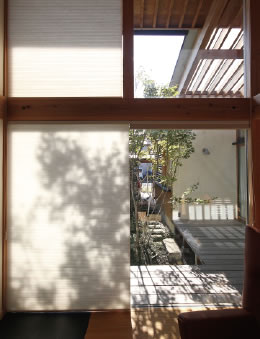 中庭の板塀とロールスクリーンを使って視線を隠している。隣家の2階からの目隠しに効果的。幅2.7mの一枚のタイプもあり継ぎ目のないシンプルな表情をつくることが出来る。