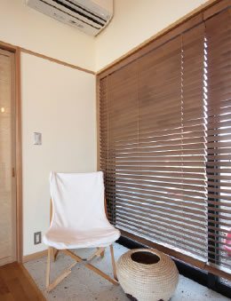 掃き出し窓からの日射とプライバシーを考えてウッドブラインドを設置。シックなダークブラウン色を使って、重厚かつリゾート感を演出。日差しや隣地からの視線を上手にコントロールしている。