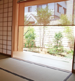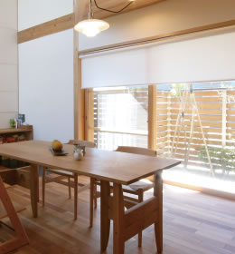 縁側の窓に取り付けたロールスダレ。透け感が良く、日中、外から室内は見えないが、中から見ると意外と外が良く見える。竹ひごや木で出来たものが多く耐久性も高くなっている。