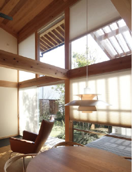 色々な窓際のスクリーンを紹介してきましたが、もっともポピュラーなスクリーンとして障子を忘れてはいけません。杉や桧の細い桟に紙一枚を貼った日本古来のスクリーンですが、光を通しつつも断熱性が高く、極めて機能性が高いスクリーンだと言えます。透過する光は他にはない心地よさを与えてくれ、単純な桟であっても美しいデザインとなります。和室だけでなく、吹き抜けのハイサイド窓に取り付けて西日除けにしたり、紙を二枚貼った太鼓障子をつくって、より断熱性の高い内障子を取り付けています。障子は引き違いで使われる事が多く、やや閉鎖的なイメージもありますが、戸袋を設けて引き込み式にすれば開放的な窓際をつくる事もできます。障子は紙の黄ばみ破れなどが気になりますが、丈夫な紙(タフトップ)もあるので、是非、積極的に取り入れていきたいと思っています。