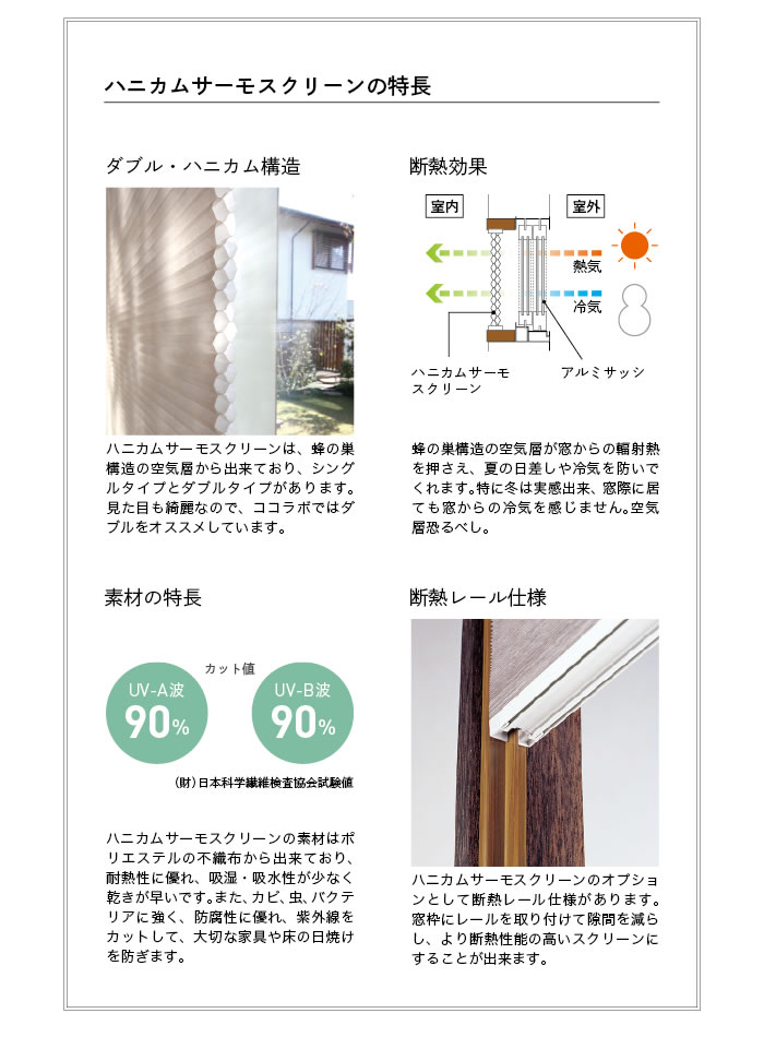 二重の空気層を持つハニカムサーモスクリーンは、空気の熱伝達抵抗を利用して高い性能を発揮している。メーカーによってシングル構造のタイプもあるが、ココラボではセイキ総業のダブルハニカムを使用している。