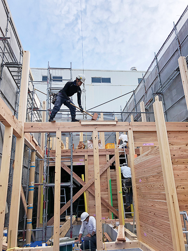 基礎工事の時期に合せて、工場で構造材の墨付け刻み工事を行います。構造図に沿って施工図、原寸図などを作成し、一本一本の木材を手加工にて仕上げていきます。その後、現場にて建て方を行い、刻まれた木材が1日~2日で組みあがっていきます。
