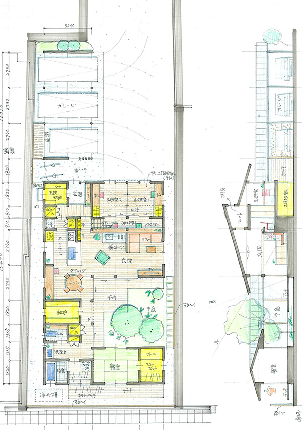 平面図や断面図、矩計図といった、家の空間や構法に関する図面を作成し、大きさや高さ、仕様などについてご説明させていただきます。その後、建具図、家具図、立面図、展開図などを作成し、詳細部分について打合せさせていただきます。