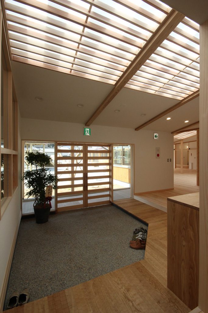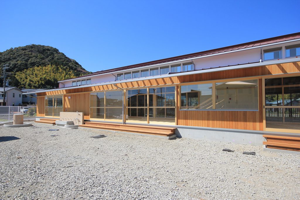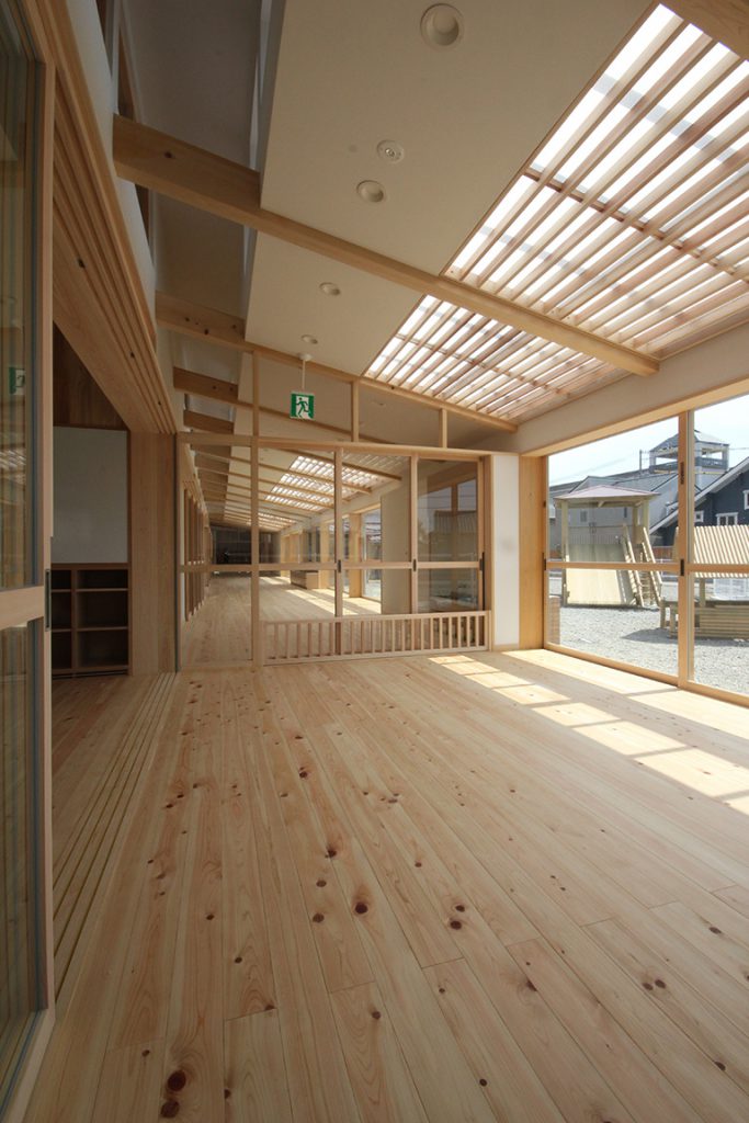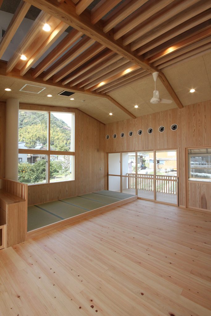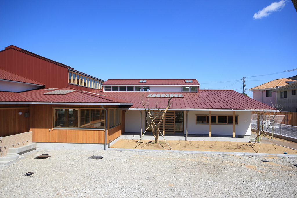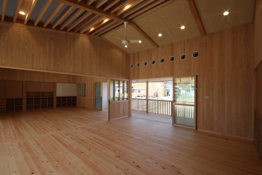 今年の春、島田市に新しい木の保育園が誕生しました。元々同地域にあった保育園の園庭が土砂災害の警戒区域に指定された事と、建物の老朽化や耐震性等の問題が重なり、今回の場所への移転として新しく計画されました。いろいろな問題はあったものの、旧園舎の周辺には小高い山や木々、田んぼなどが広がり、自然と一体となった遊びや体験を軸とした保育が評判の保育園でした。私たちが提案した園舎は“保育理念=園舎づくり”をテーマに、周辺環境が変わっても、旧園舎での思い出や取り組んできた保育を活かせる園舎をつくりたいと考え、リズム体操が出来る広い遊戯室を確保し、保育室などから周辺の山々が見渡せ、園舎と園庭が一体となったプランを提案しました。合わせて、地域の木材をふんだんに使い、仕上げにも木を現した保育園とし、優しく暖かく、そして地域の自然を身近に感じられる内部空間としました。