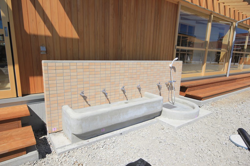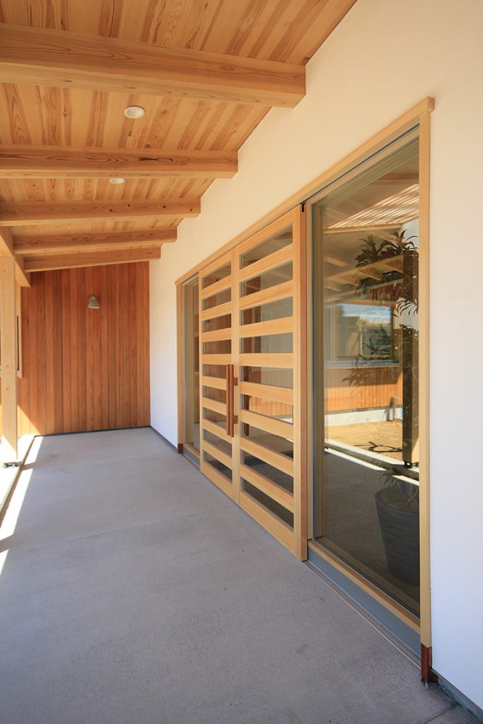 | 外部仕上 | 構造材/柱・梁:杉材・桧材 含水率20%以下(静岡県産材) 屋根/ガルバリウム鋼板縦ヒラ葺き 軒天/木毛セメント板TSボード15㎜、杉Jパネル貼り30㎜ 外壁/ガルバリウム鋼板貼、漆喰コテ押さえ仕上げ、杉赤本実板縦貼 外部建具/木製オリジナル建具 桧、ペアガラス アルミサッシ(ペアガラス) |