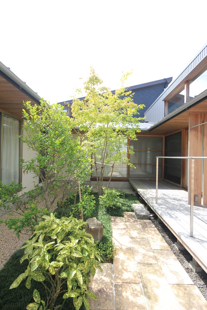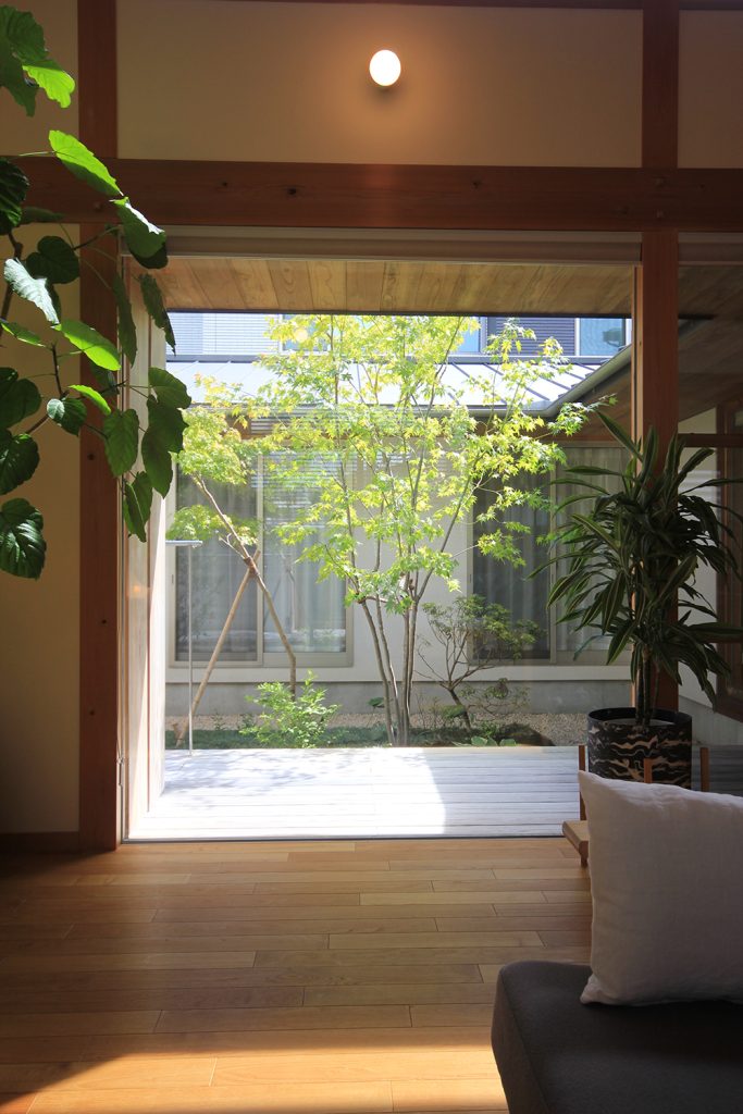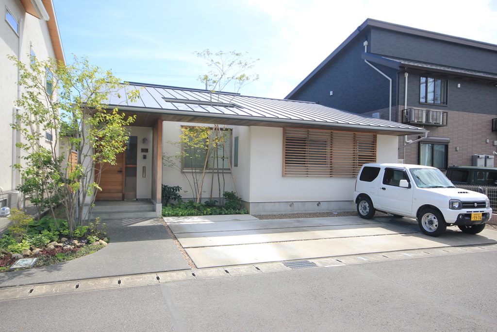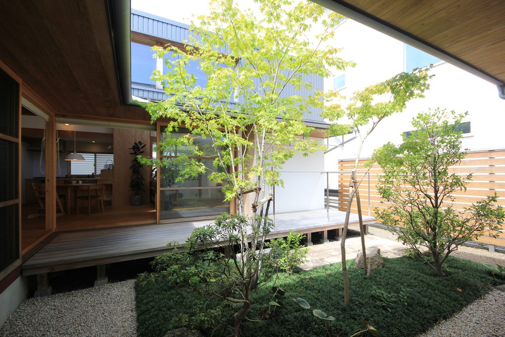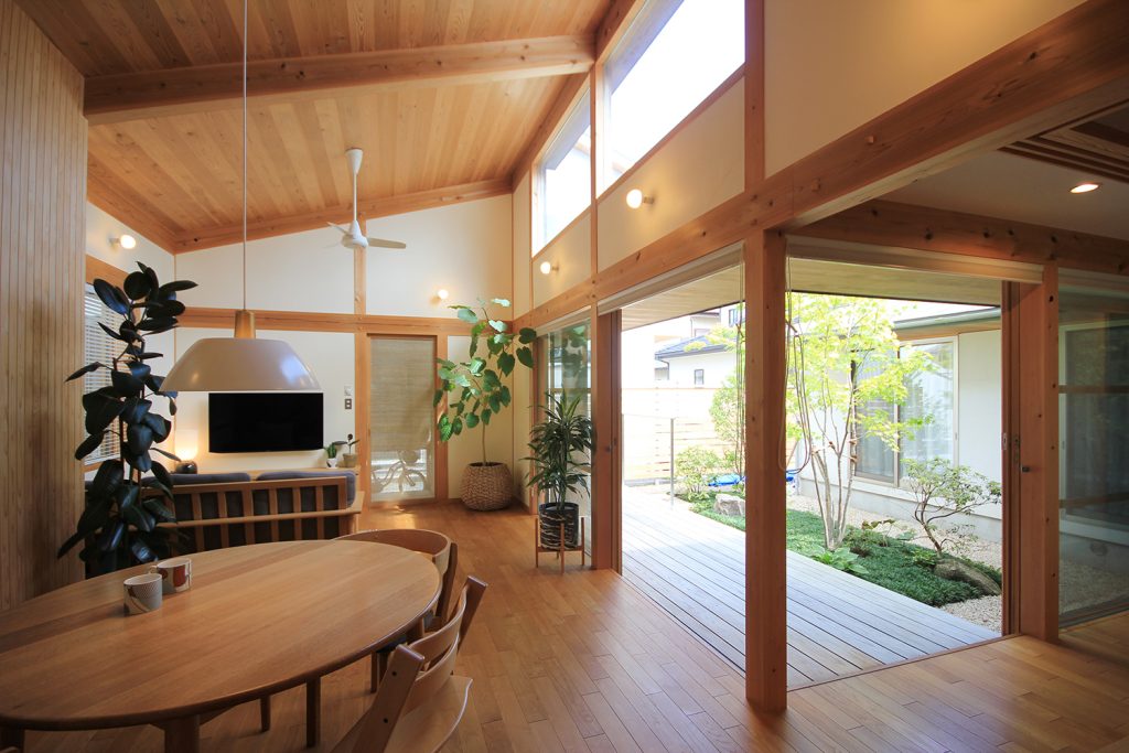 2018年の初夏に完成したTさんのお宅は、焼津市の区画整理地内に建築されました。道も広く周辺環境も良い場所で、暮らしていくにはとても利便性の高い土地でしたが、計画当初、隣接する土地にどんな家が建つのかわからないことが問題でした。様々なケースを想定して考えていく必要がありましたが、以前3方を住宅で囲まれた敷地での計画を思い出し、今回も敷地の形状が似ていることから、中庭のあるコの字型のプランを提案しました。Tさんの家の建築中にはあっというまに住宅が建ち、囲まれた敷地となりましたが、周辺が気にならない静かで落ち着く空間になりました。