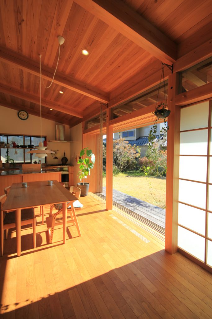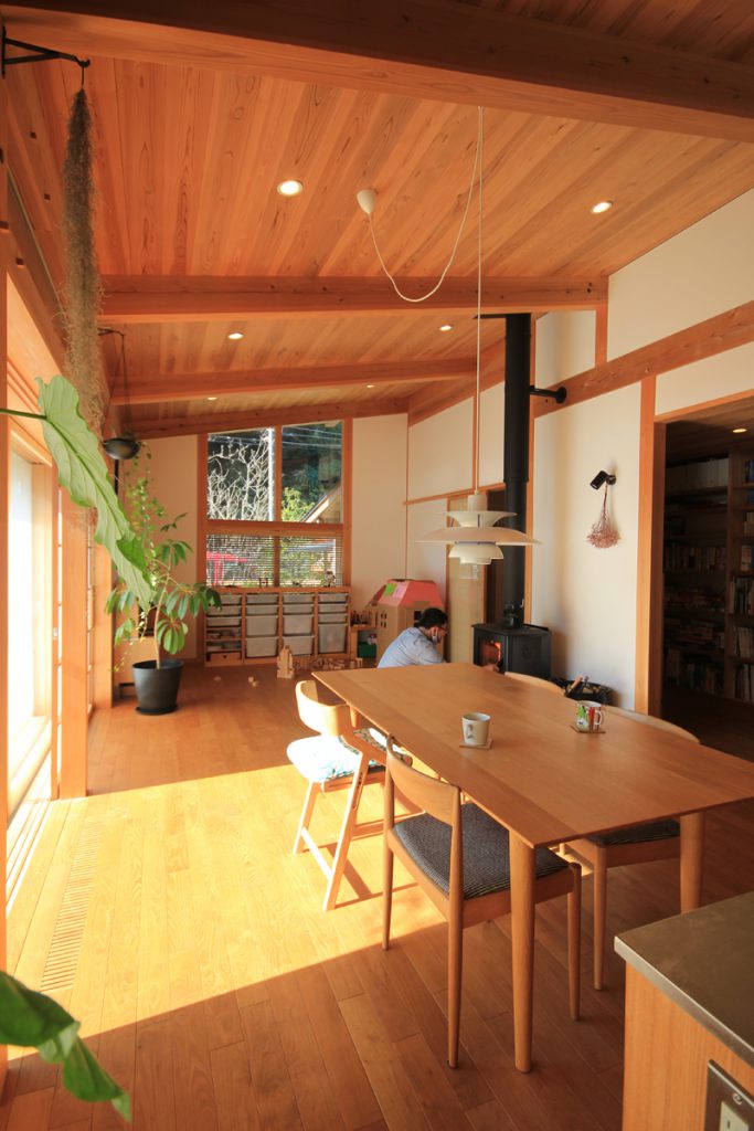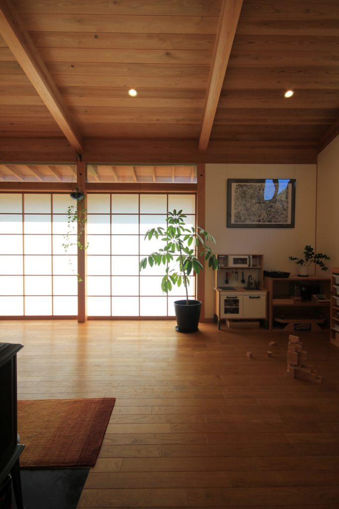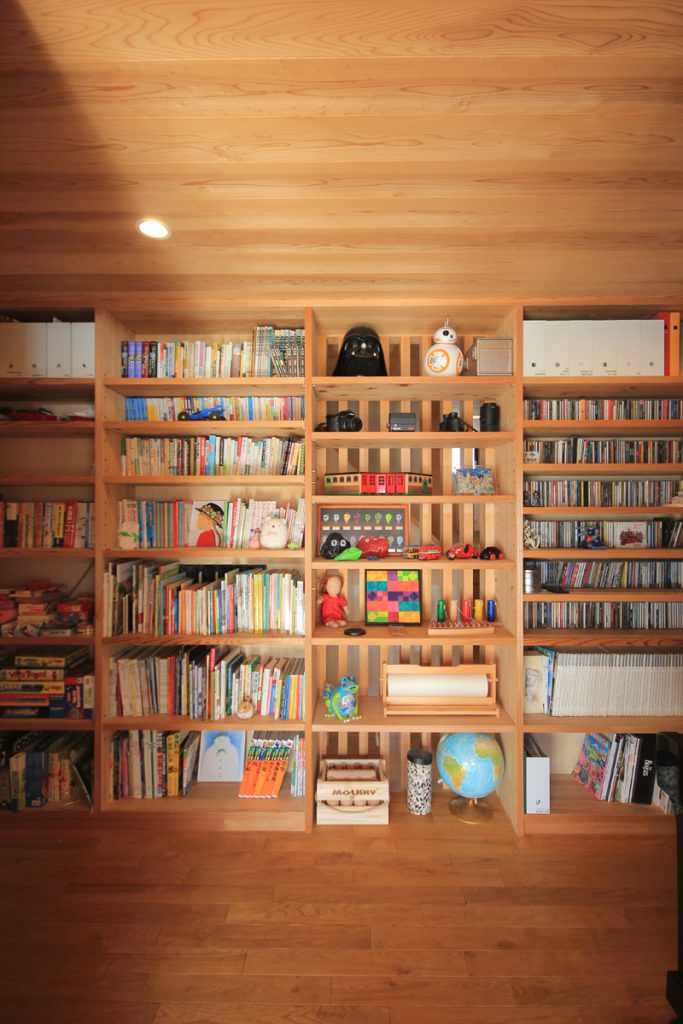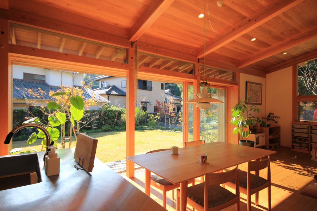 Iさんの家は、ご夫婦とお子さん2人の4人でお住まいのお宅です。繋がった敷地にご両親の家もあり、ご実家とお隣さんの関係で暮らしています。建築までのプロセスは苦労があり、1年以上の時間を要しましたが、完成後の建物を見ると、燦々とした太陽が差し込む広間と、広い芝生の庭がつながり、暖かく開放的なお宅になりました。Iさんのお宅の中心には大きな書庫があり、書庫を中心としてぐるっと回れる回廊式の間取りになっています。お気に入りの物を中心に置かれ、暮らしの中心にもなっています。また、庭の植栽にもこだわりがあり、季節ごとに変化する植栽は、毎日の暮らしに彩りを与えてくれます。