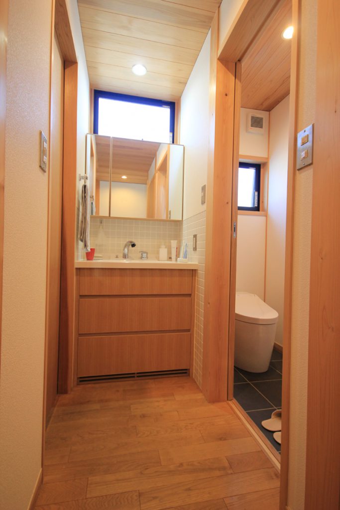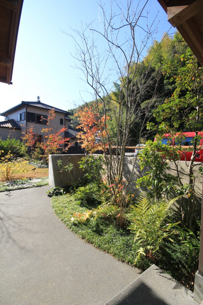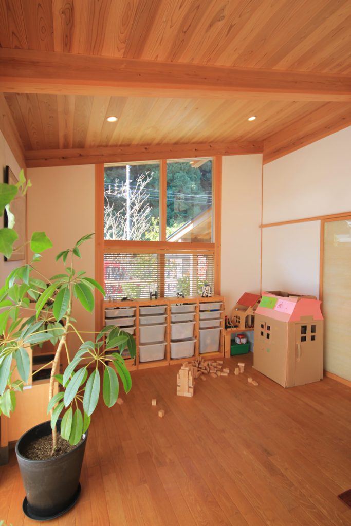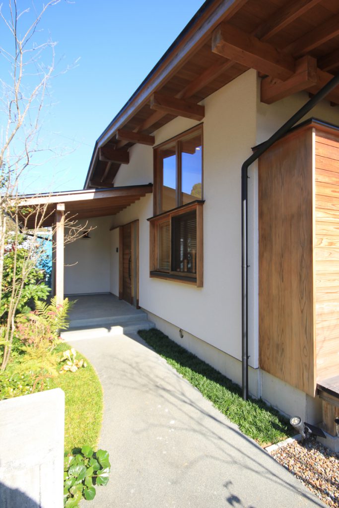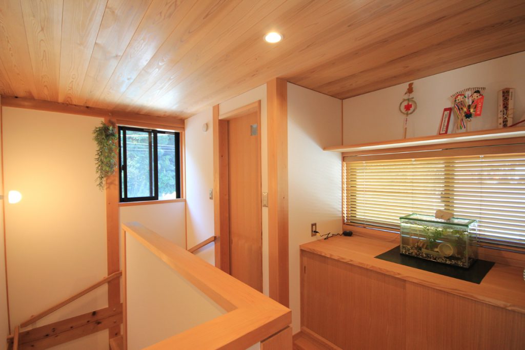 Iさんの家は、ご夫婦とお子さん2人の4人でお住まいのお宅です。繋がった敷地にご両親の家もあり、ご実家とお隣さんの関係で暮らしています。建築までのプロセスは苦労があり、1年以上の時間を要しましたが、完成後の建物を見ると、燦々とした太陽が差し込む広間と、広い芝生の庭がつながり、暖かく開放的なお宅になりました。Iさんのお宅の中心には大きな書庫があり、書庫を中心としてぐるっと回れる回廊式の間取りになっています。お気に入りの物を中心に置かれ、暮らしの中心にもなっています。また、庭の植栽にもこだわりがあり、季節ごとに変化する植栽は、毎日の暮らしに彩りを与えてくれます。