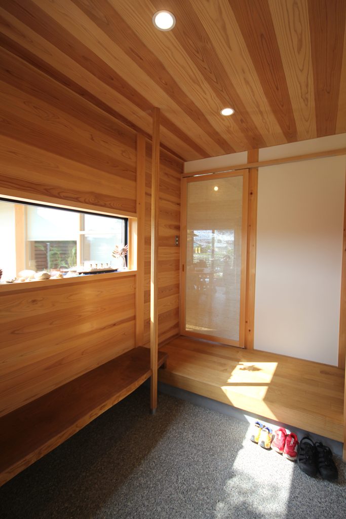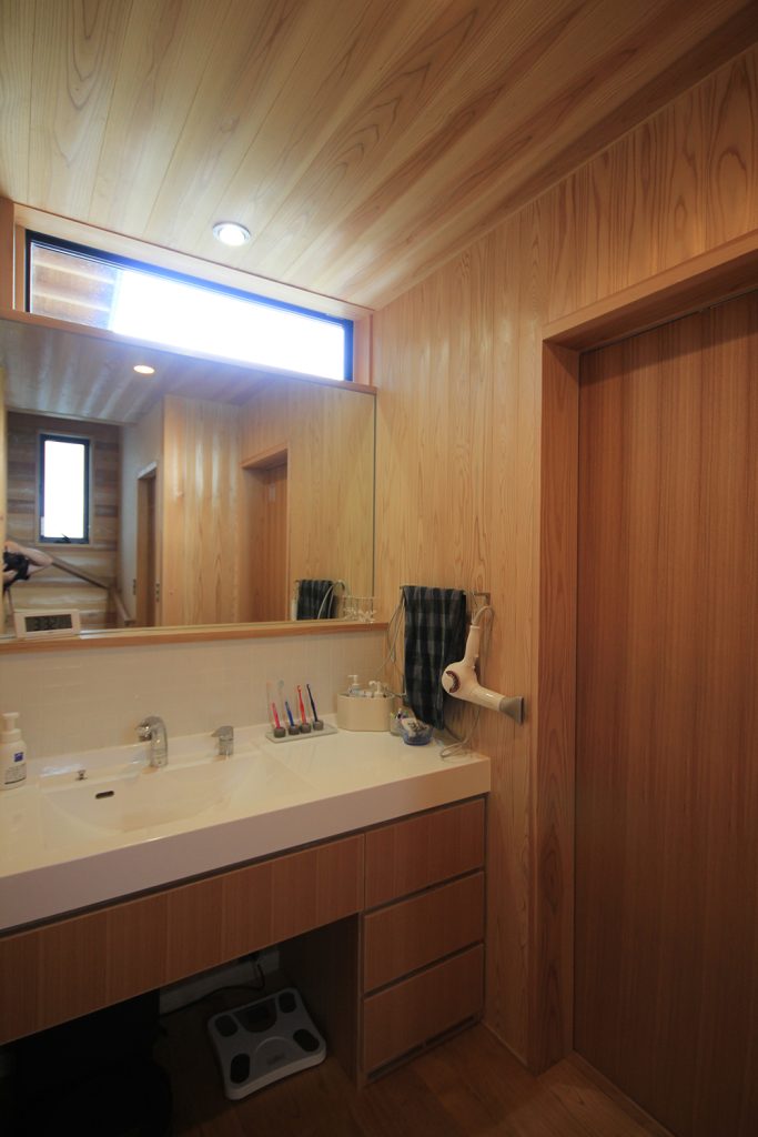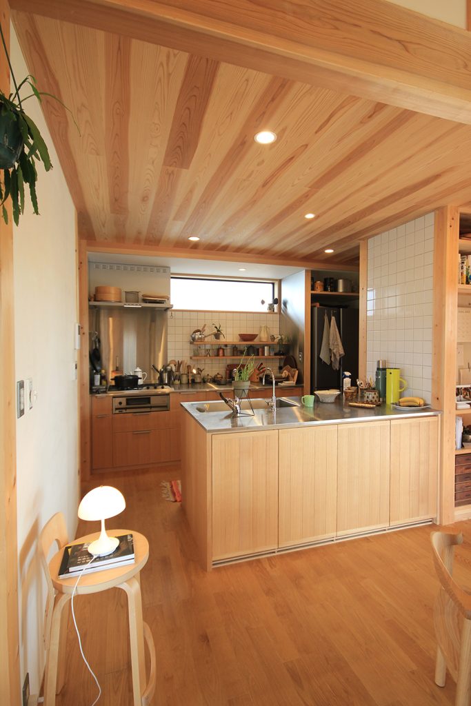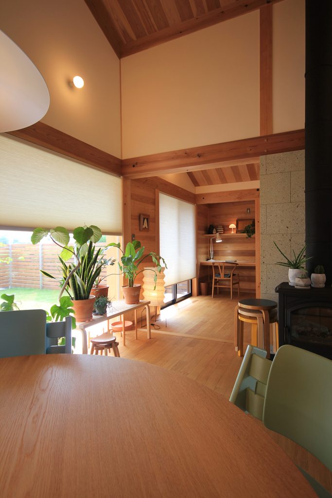 内部は、なるべく平屋で暮らせる間取りを優先的に考え、現在の4人生活を考えつつも、将来の夫婦2人生活を想定し必要なスペースを考えていきました。家族の集まる広間スペースを建物中心に、南と北の庭のどちらにもつながる窓を設けました。南の窓は家の中からもデッキを通じて植栽が楽しめます。北の窓は、薪を運んだり、家庭菜園へ出入りなど生活動線を重視してしました。