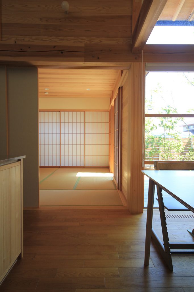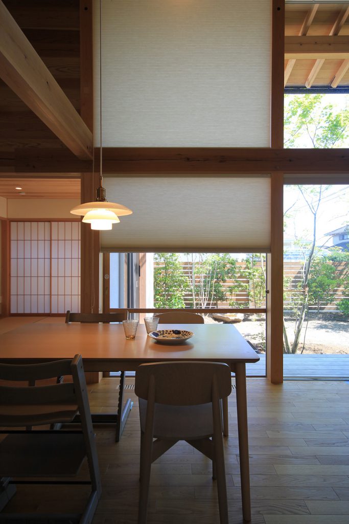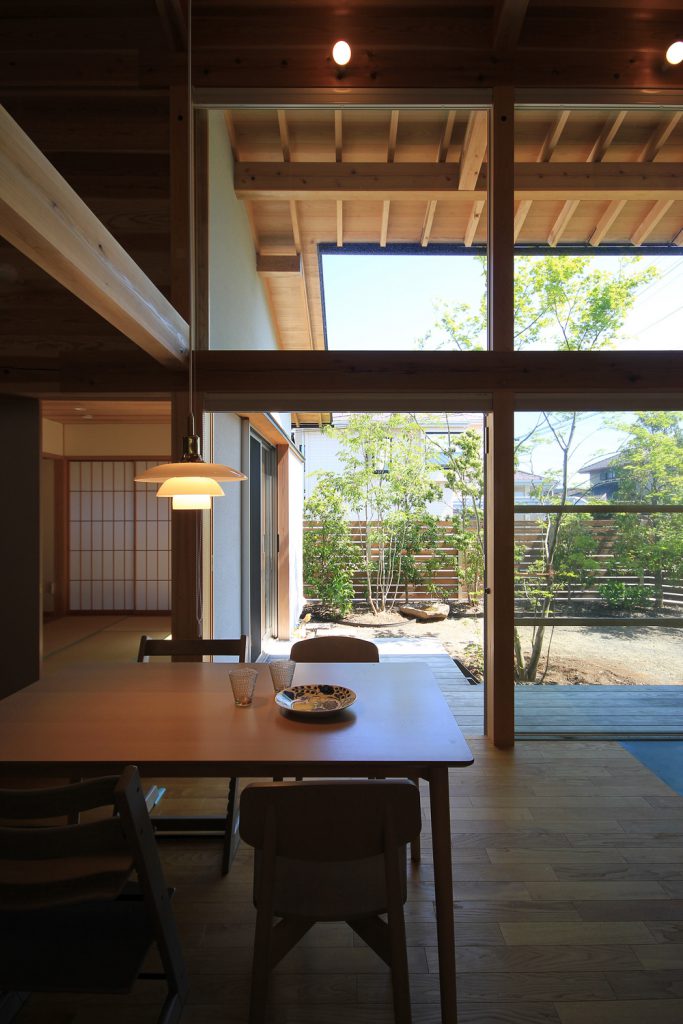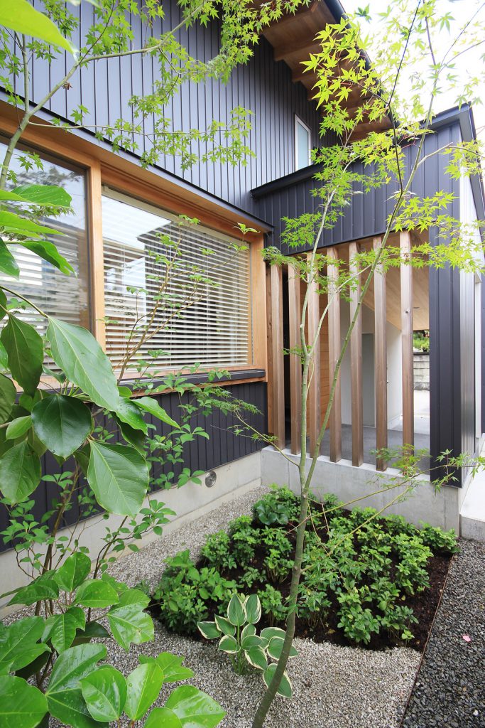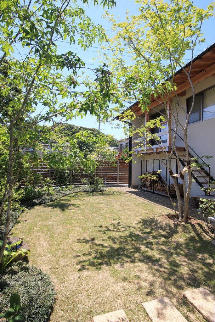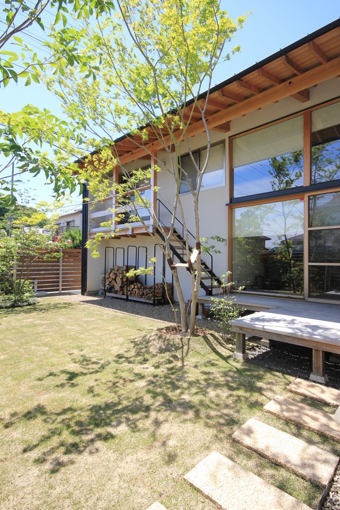 完成して一年のタイミングで庭づくりをし、たくさんの緑に囲まれた『満の家』。広間の大きな窓から見える若葉やデッキに映る木漏れ日、外階段やベランダから見る花や鳥。それらひとつひとつが家族の思い出となり、今後かけがえのない住まいになっていくと思います。