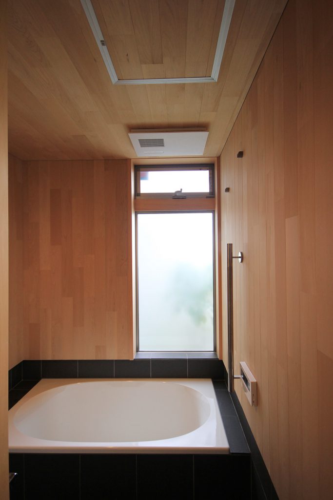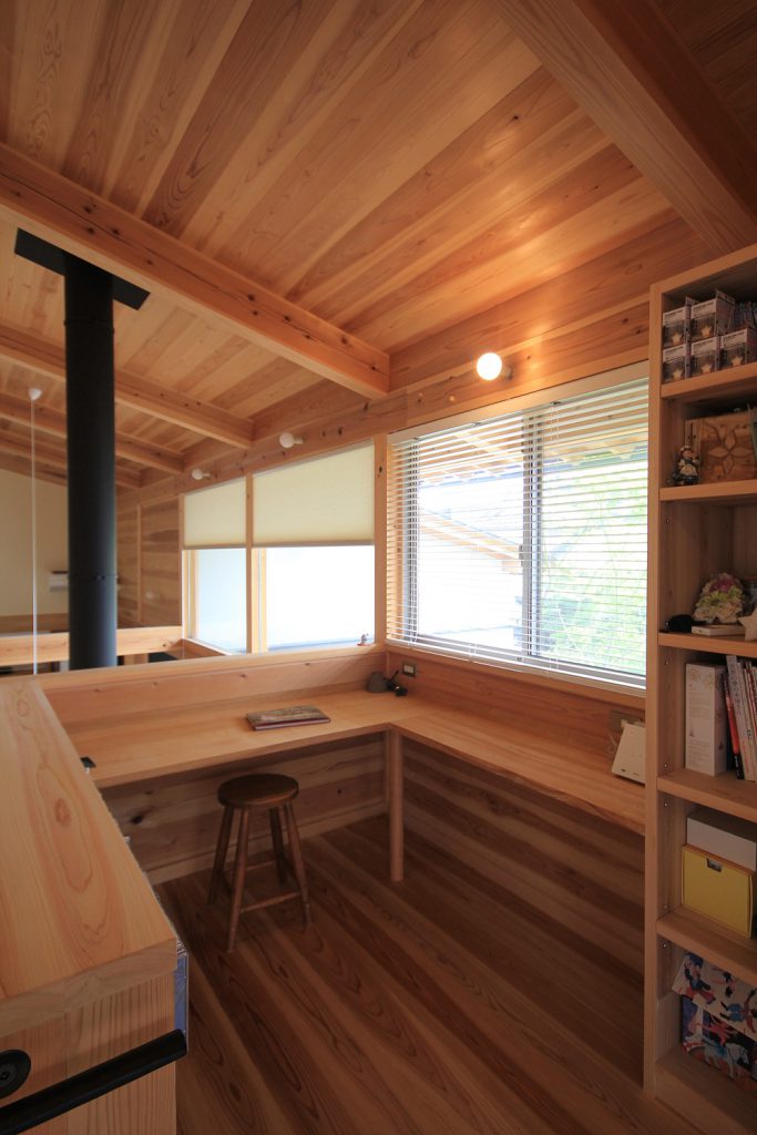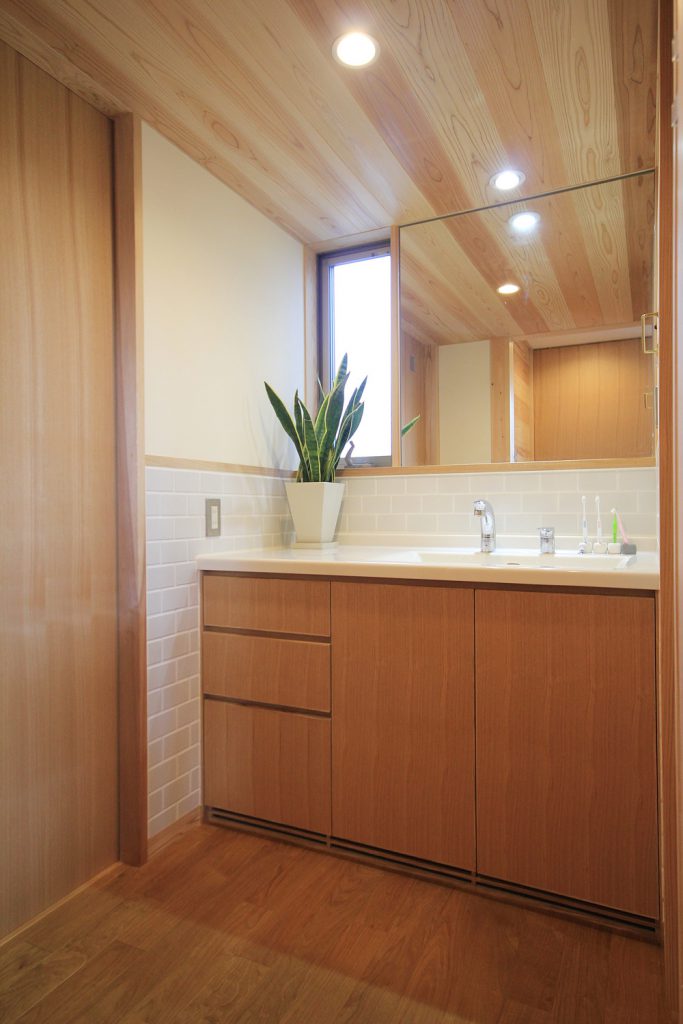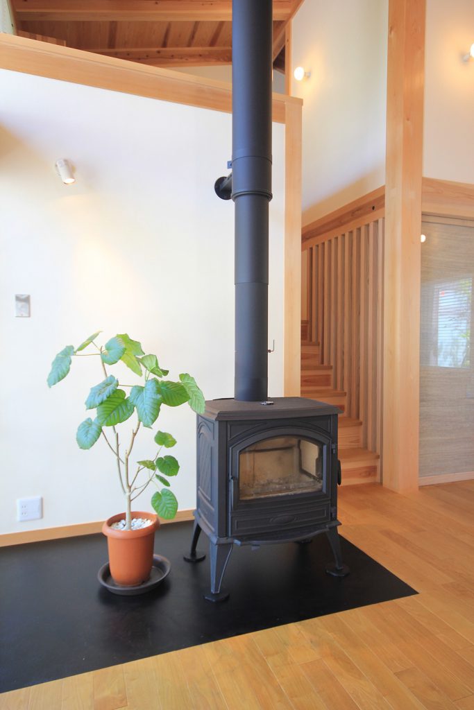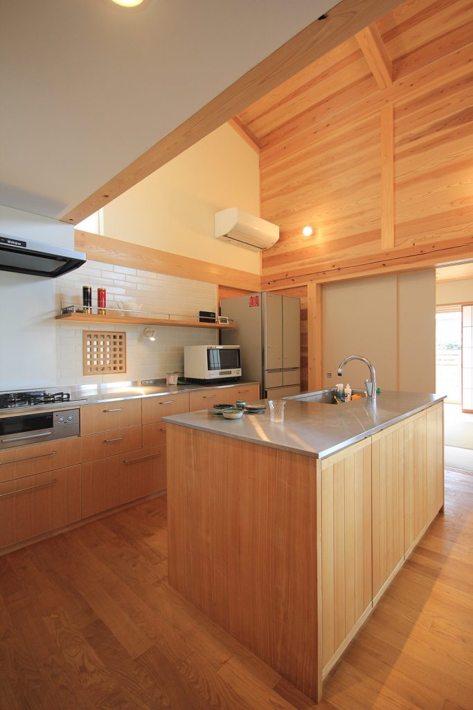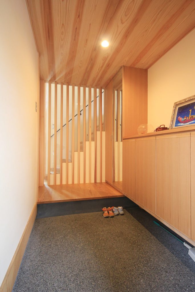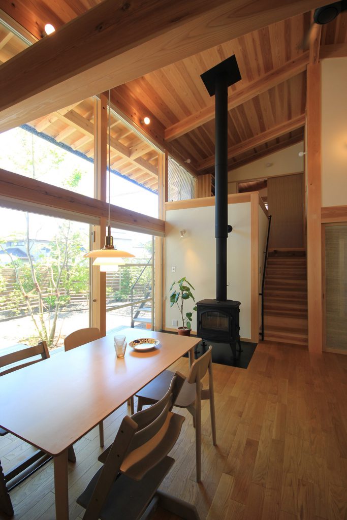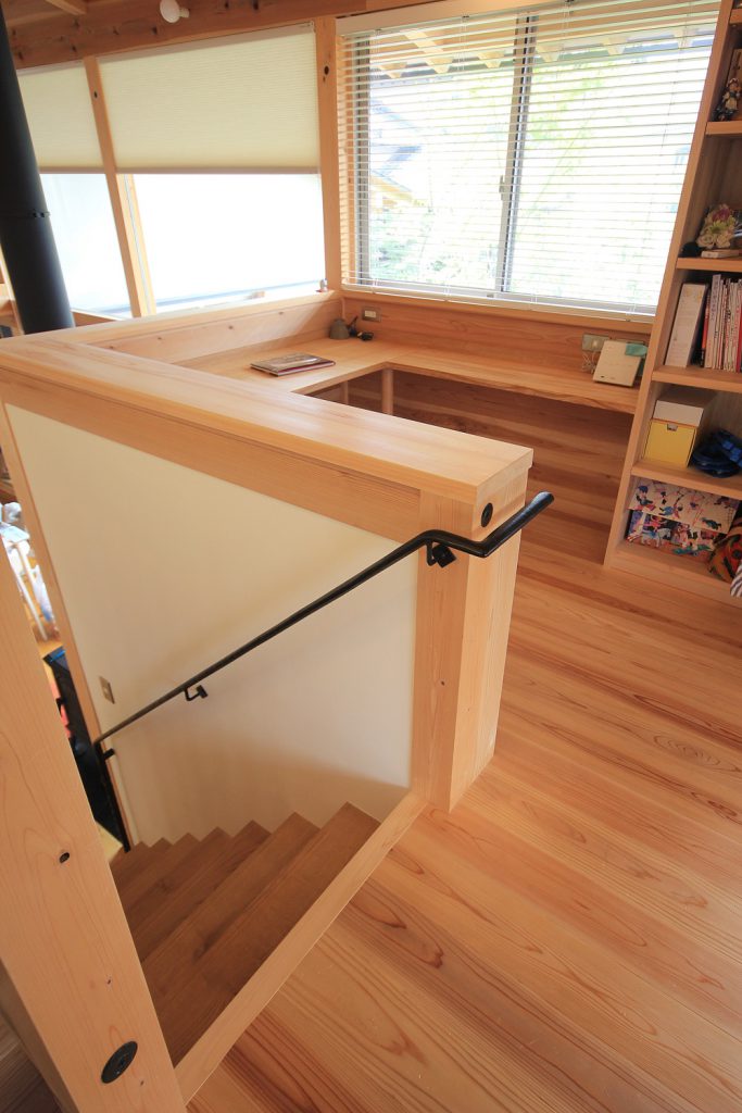『満の家』は、敷地の高低差を活かした中二階のあるお宅です。一般的な階段は、13〜15段で2階に上りますが、Kさんのお宅では高低差を活かして8段で上がれる階段にしました。2階との高さを低くすることで、一般的な2階建てと比べて1階との距離が縮まり、家族をいつも近くに感じられ、また吹抜けを通じて横に広がる空間となりました。