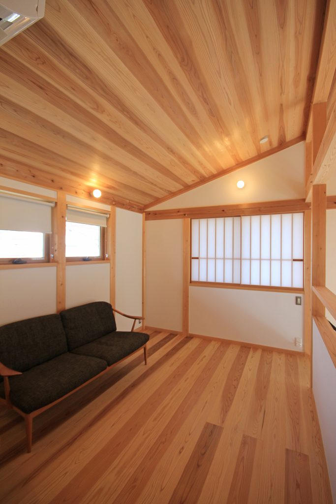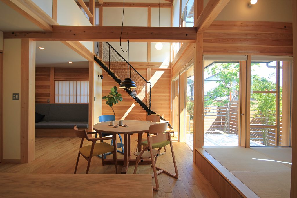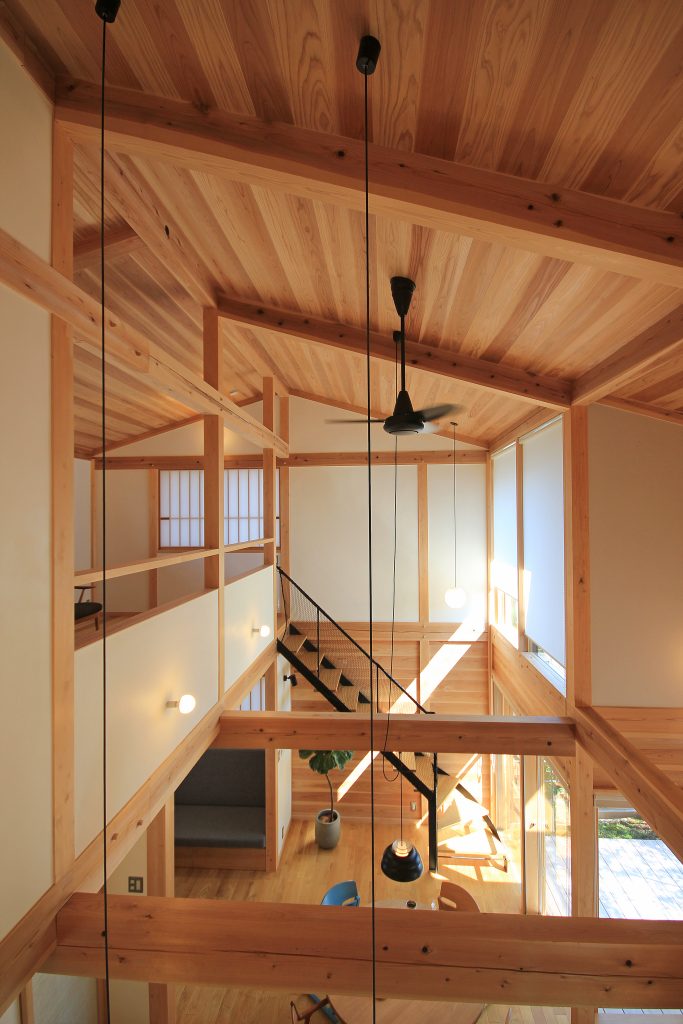 Sさんのお宅は、広間とキッチン上部に広がる大きな吹き抜けが特徴です。吹き抜けなど立体的な空間がある事でとても広く感じ、部屋の体積が大きくなり自然と空気の循環が起こります。シーリングファンを回せば、断熱性能を高めることで室内の湿度分布を小さくし、夏冬とも快適に過ごすことができます。