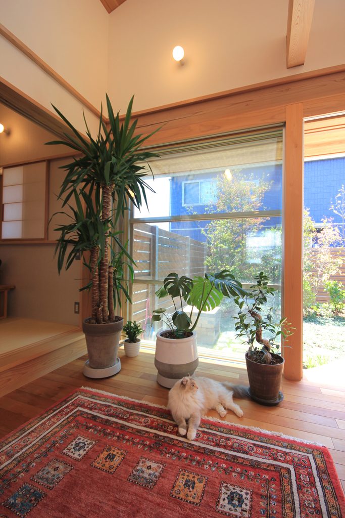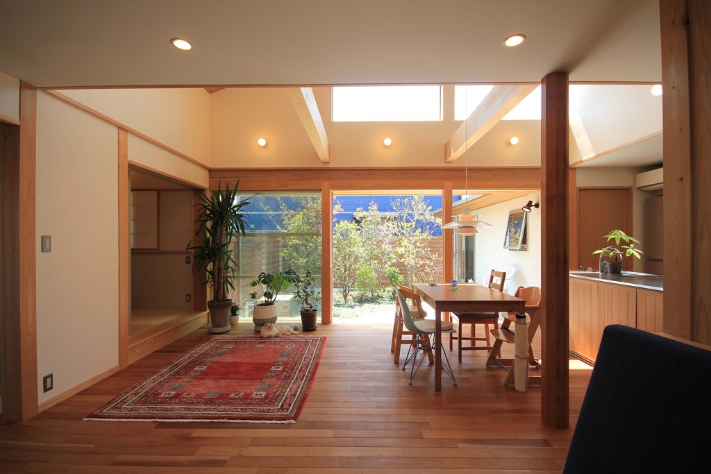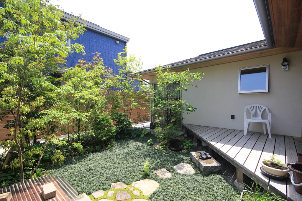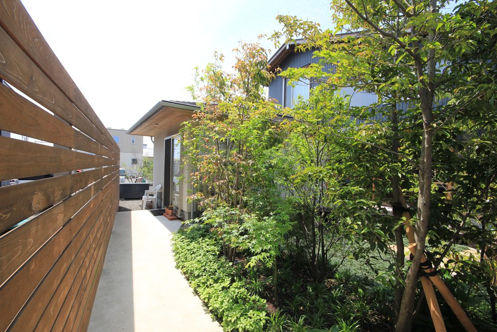 中庭は隣家やアプローチからの目隠しの役割を持たせ、視線を遮る常緑樹を多く植えること最初の段階からプランに含めていました。葉の茂った木が中庭にあることで住居の大きな窓を開けていても気にならず、住居とアトリエどちらも解放感がありつつもプラバシーに配慮したプランになりました。