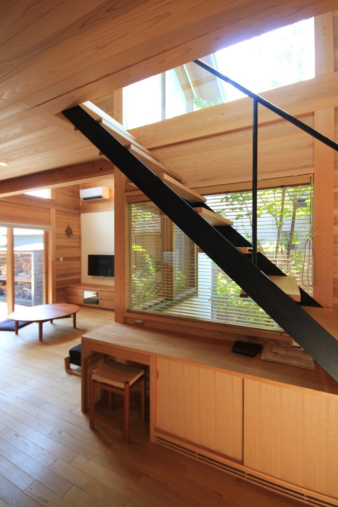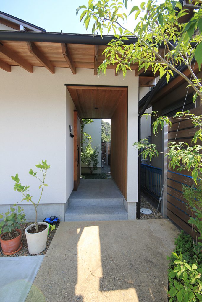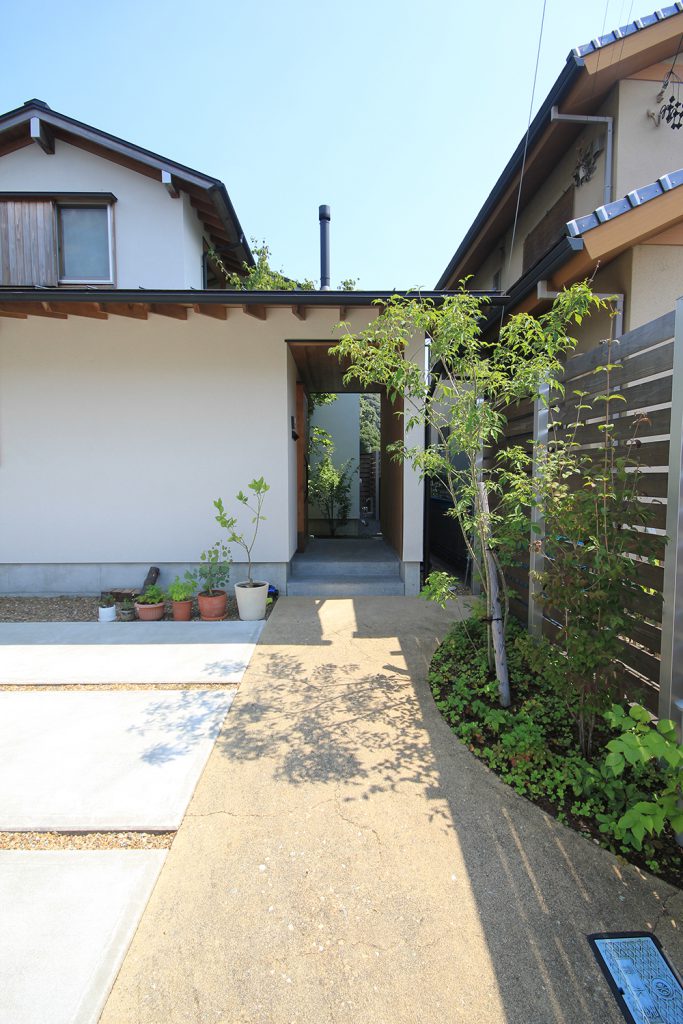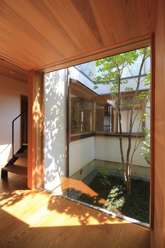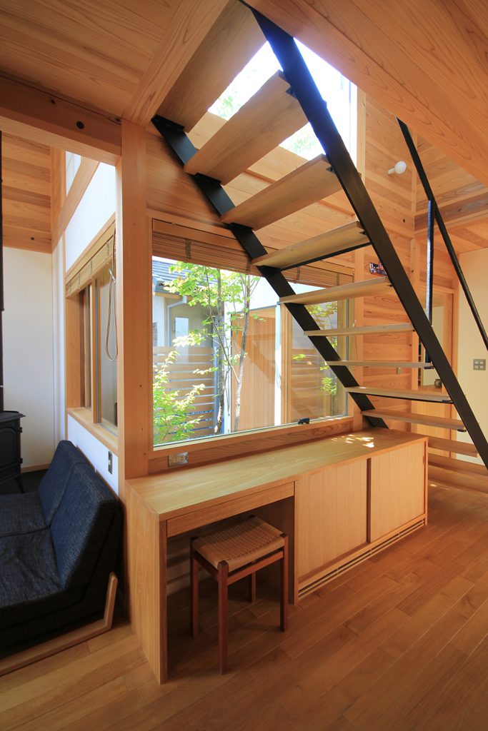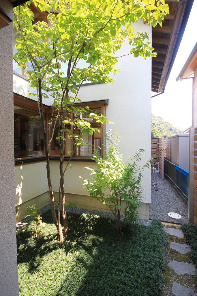 ちょうど2年前に完成したHさんのお宅は、どの部屋も明るく風通しの良い住まいで、ご夫婦と3歳になるお子さんの3人住まいです。昨今の状況から、リモートワークなどで家にいる時間が増えた方も多いと思いますが、窓を開けて心地よい風を感じる仕事時間も良いものだと思います。Hさんのお宅は南北に住宅のある敷地で、日当たりやプライバシーについて少し心配がありましたが、建物の形を工夫し、坪庭や中庭、ウッドデッキなどの外部空間を意図的につくり、隣家との間に適度な緩衝空間を設けたことで、隣家が気にならないだけでなく、坪庭などを通して風と光を取り込む豊かな空間ができました。