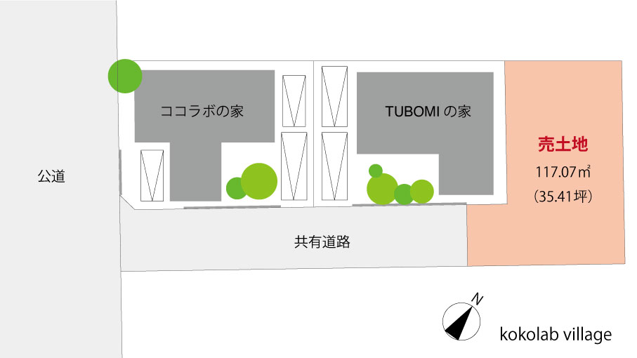 静岡市駿河区にkokolab vllageと題した小さな分譲地があります。区画は3つあり、ひとつは当社の常設展示場として現在工事中。もうひとつは先日完成した『TUBOMIの家』のMさんのお宅となり、今回3区画目の土地の住まい手を募集します。kokolab vllageは、街中ではありますが、たくさんの緑に包まれ、暮らす人にも、地域の人にも、そこを通る人にも優しい小さな街かどをつくりたいと考えています。場所は静岡駅まで徒歩20分程の住宅地にあり、買い物や移動などの利便性も高い場所です。ご興味のある方は当社までご連絡ください。