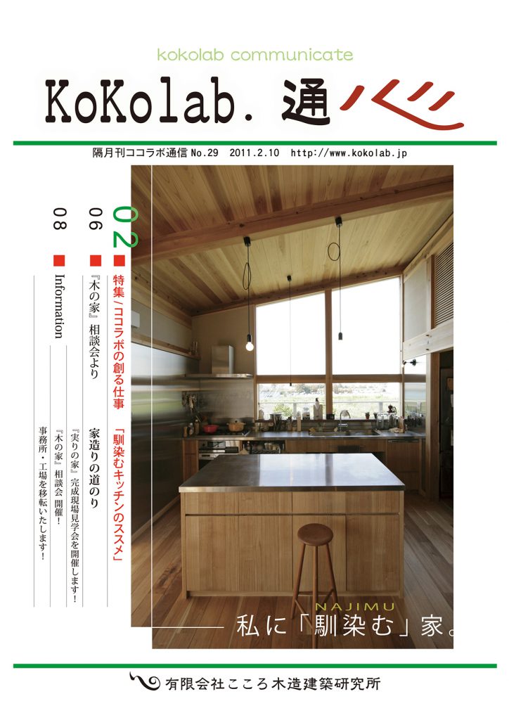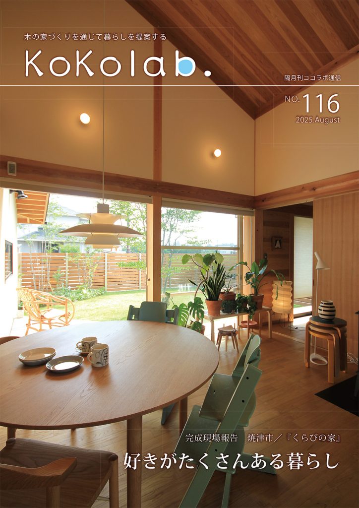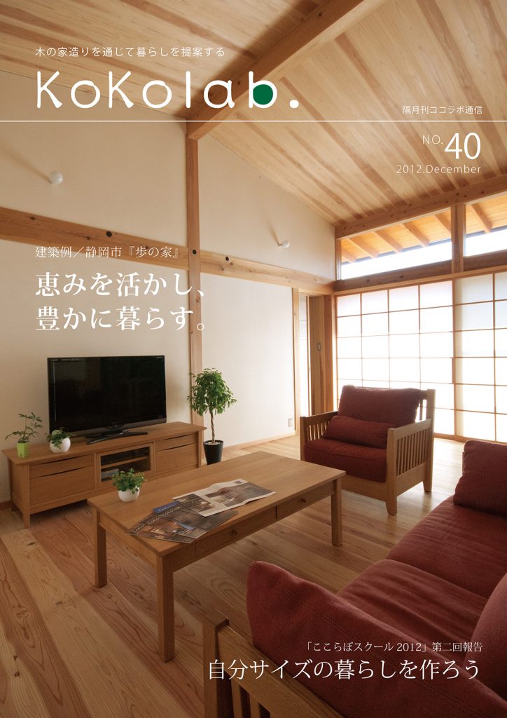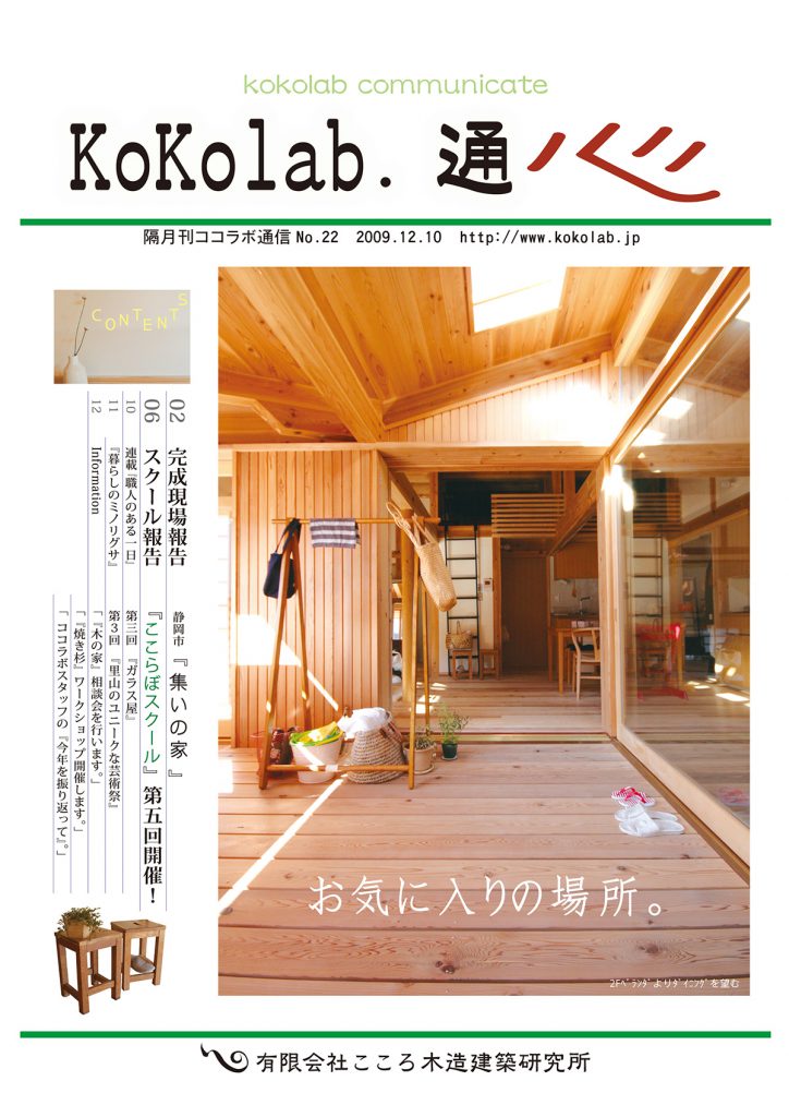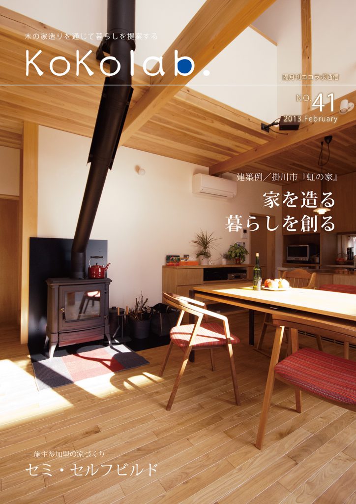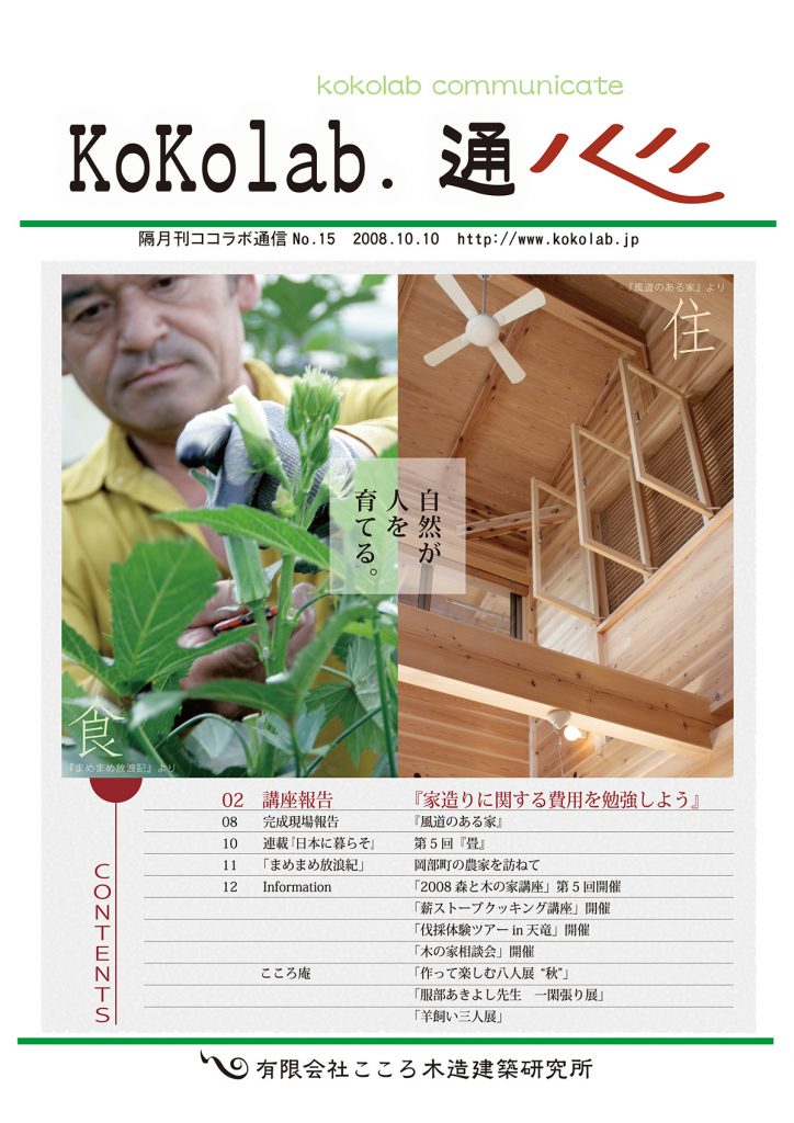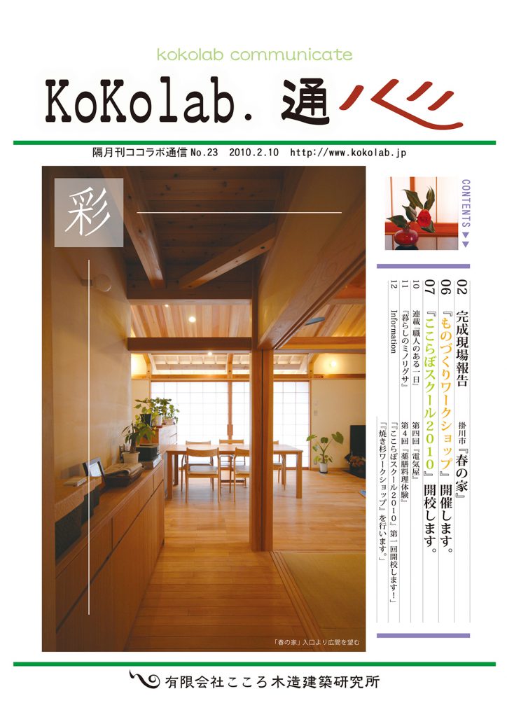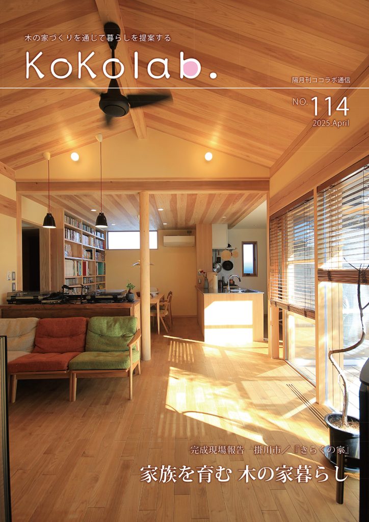 建築事例では、木の家を建築するまでの様子や、暮らし始めてからの体験、完成してから数年経過した木の家の変化などの実例をもとにご紹介し、こらから木の家を建てたいとお考えの方などにご好評をいただいています。また、こだわりのお店紹介では、おススメの商品紹介や、新しいイベント告知などをしています。ココラボ通信は、希望の方に定期的に郵送させていただいています。また、kokolab通信の設置店さんで無料配布しています。是非お手に取ってご覧ください。