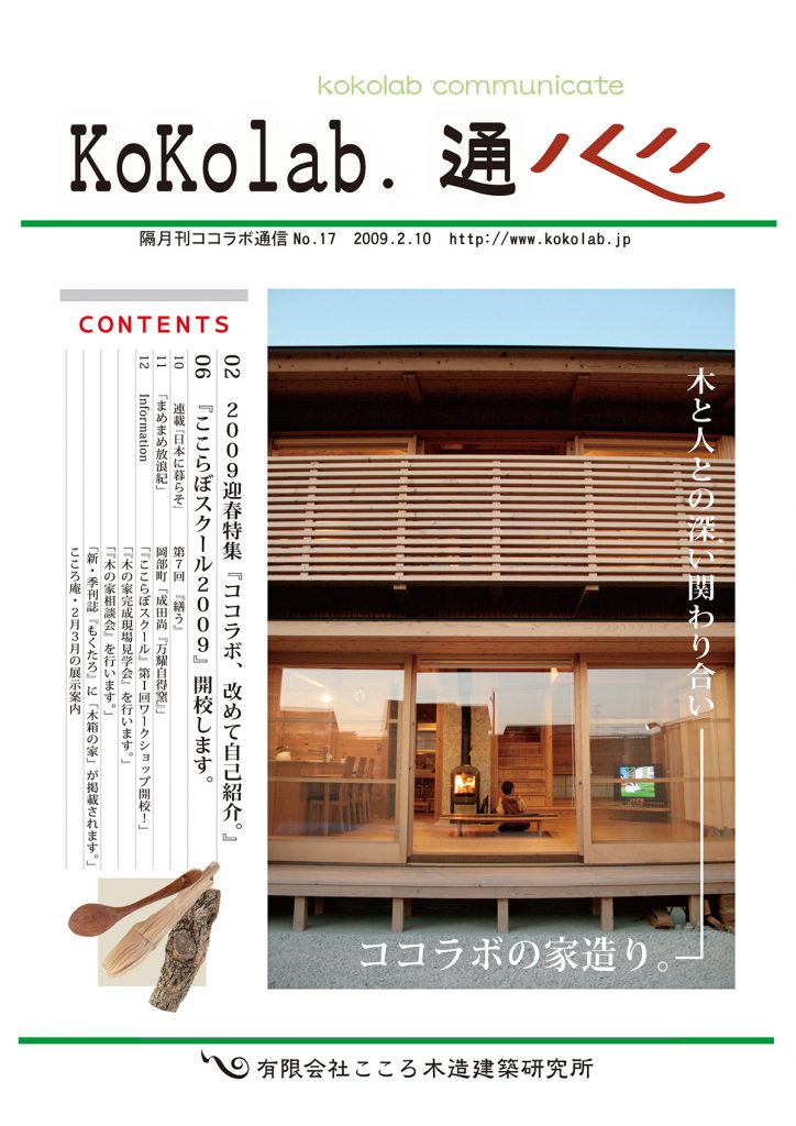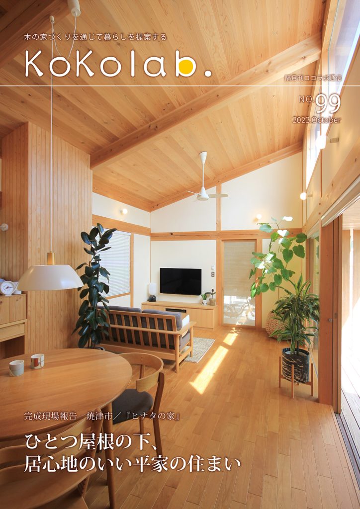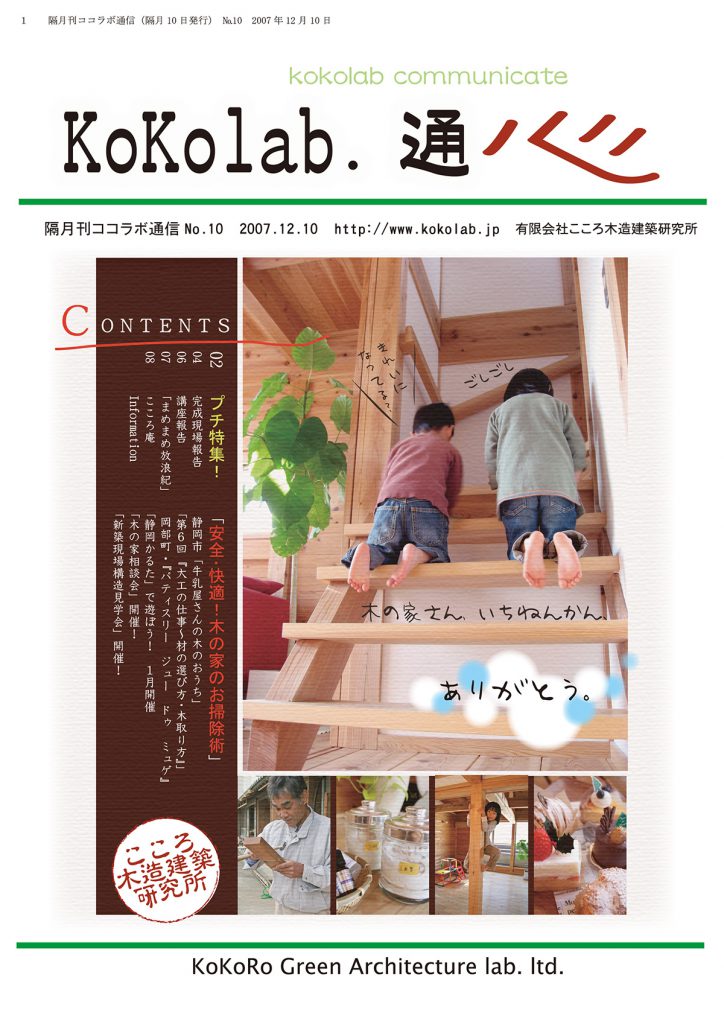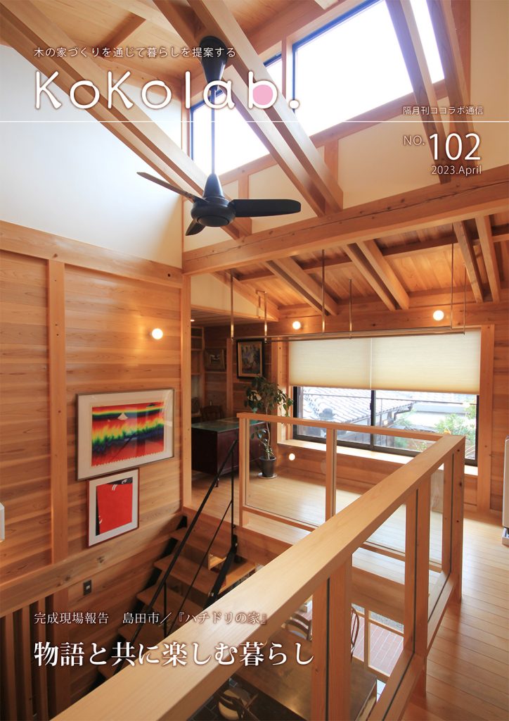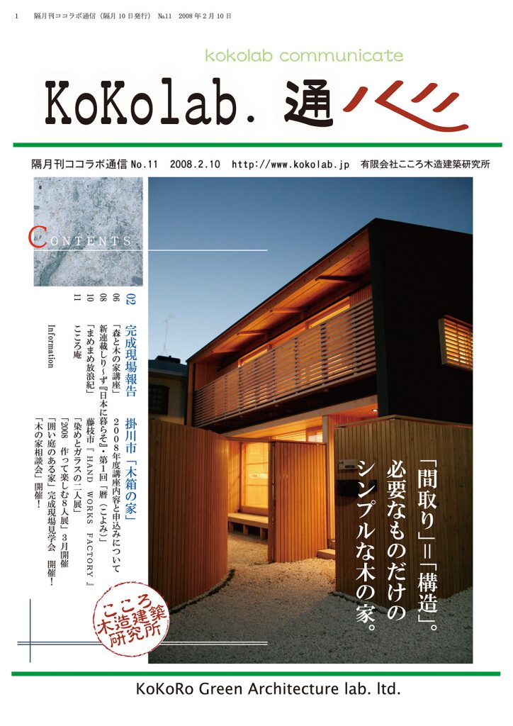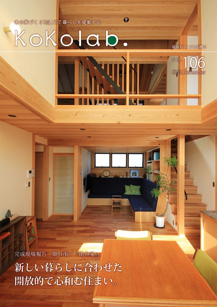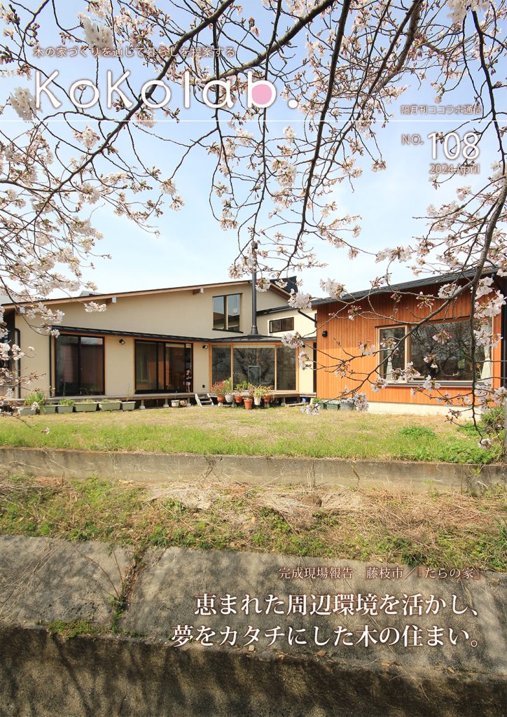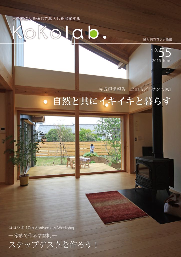 建築事例では、木の家を建築するまでの様子や、暮らし始めてからの体験、完成してから数年経過した木の家の変化などの実例をもとにご紹介し、こらから木の家を建てたいとお考えの方などにご好評をいただいています。また、こだわりのお店紹介では、おススメの商品紹介や、新しいイベント告知などをしています。ココラボ通信は、希望の方に定期的に郵送させていただいています。また、kokolab通信の設置店さんで無料配布しています。是非お手に取ってご覧ください。