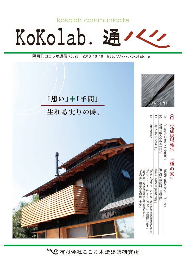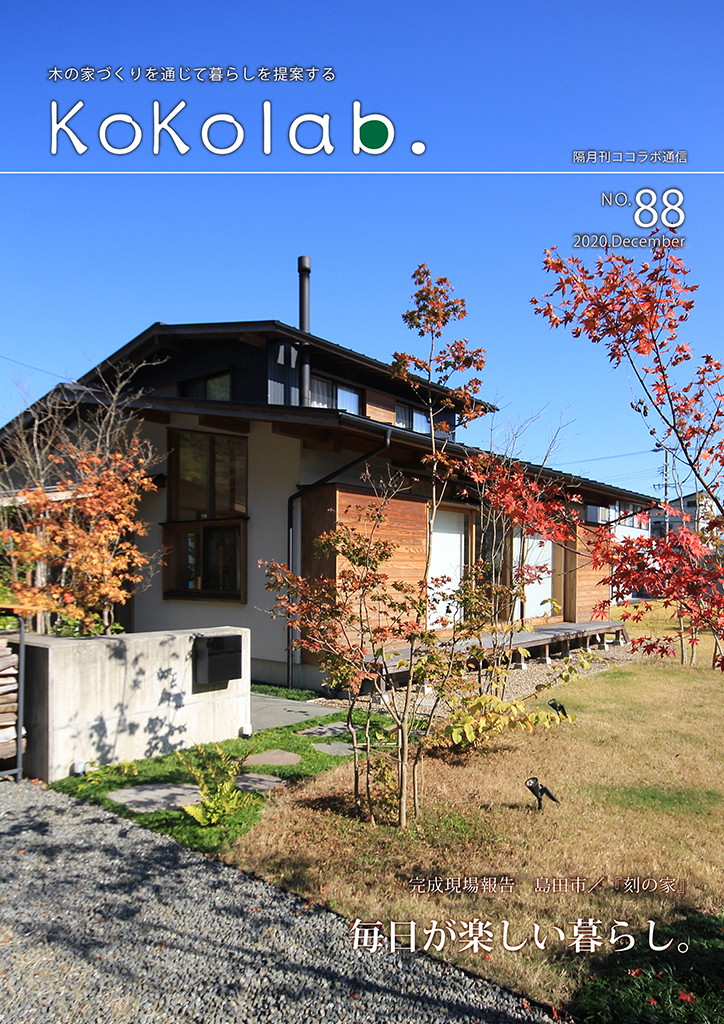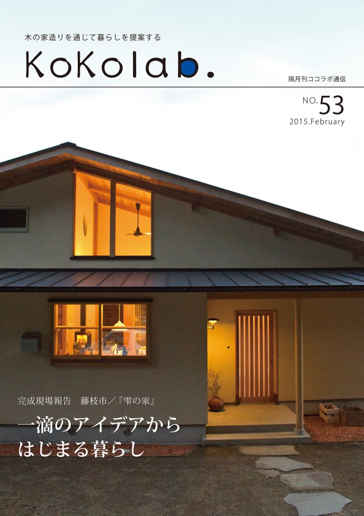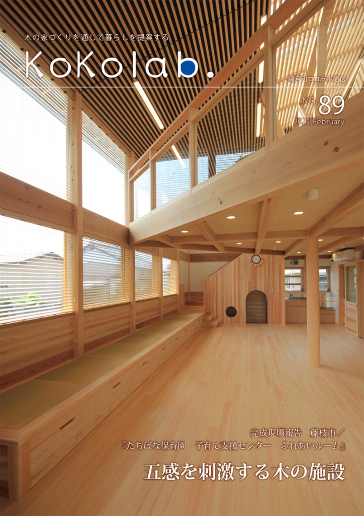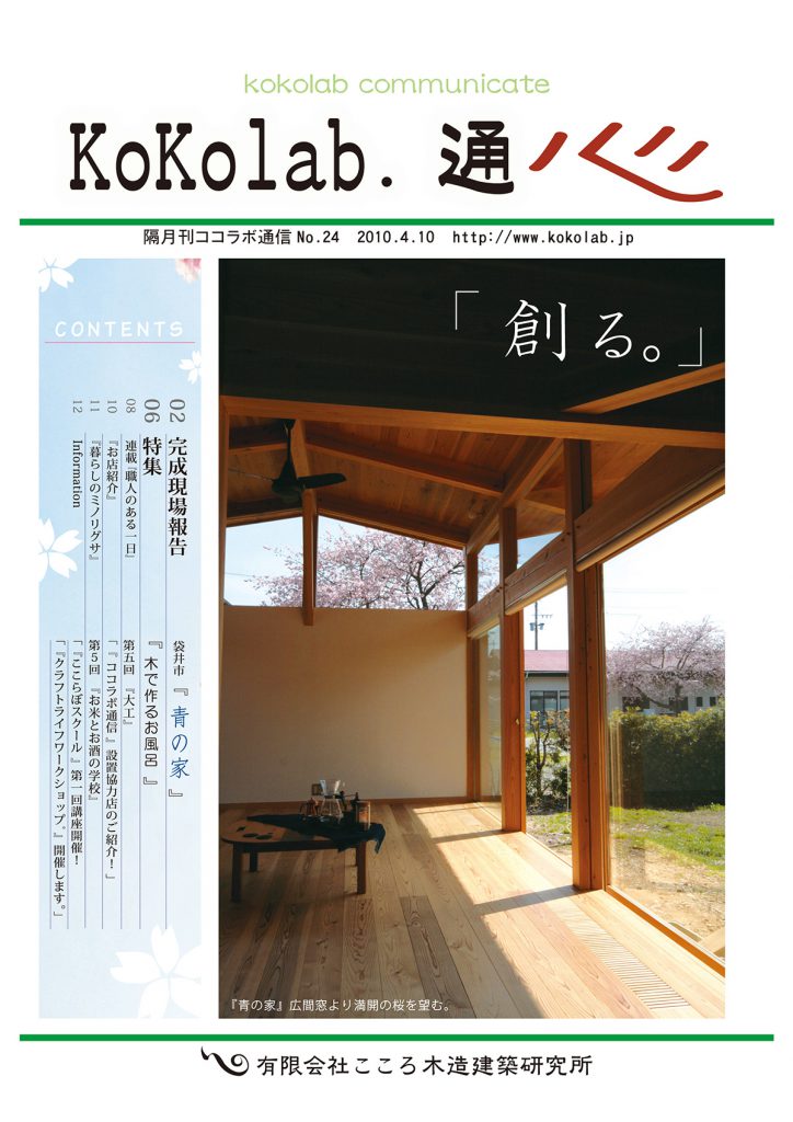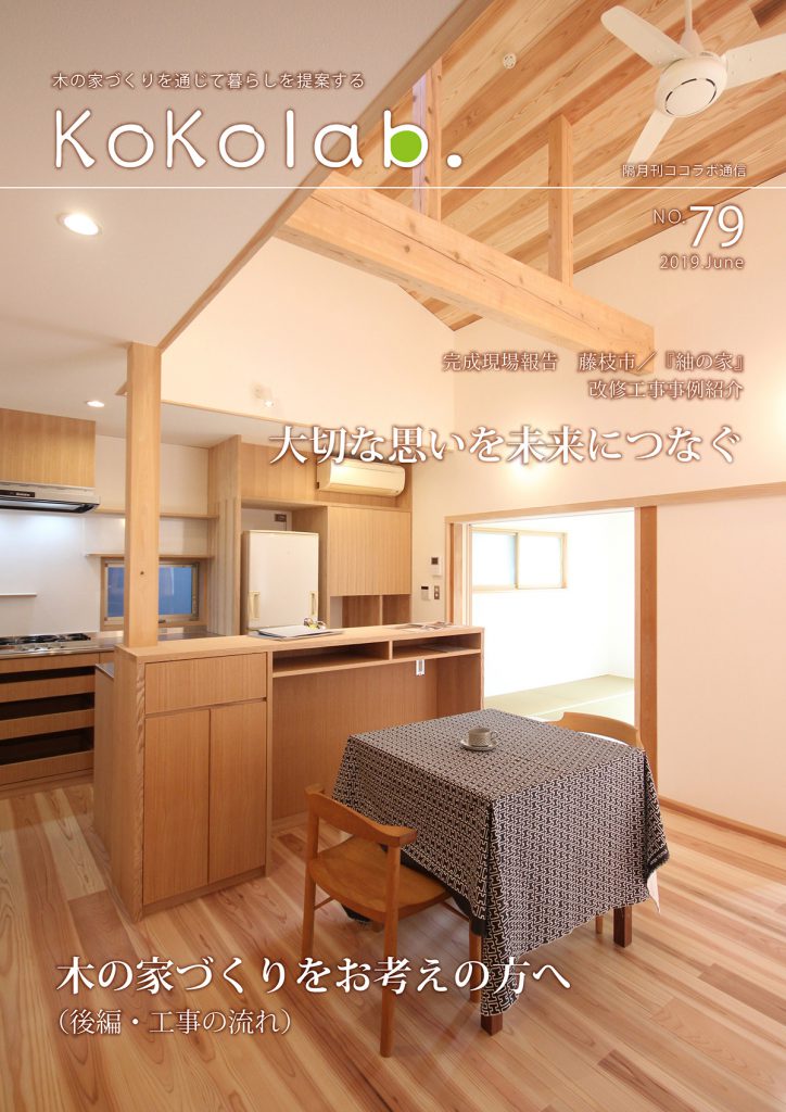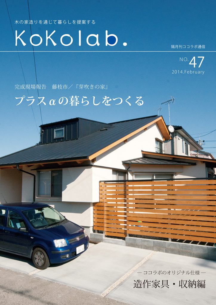 建築事例では、木の家を建築するまでの様子や、暮らし始めてからの体験、完成してから数年経過した木の家の変化などの実例をもとにご紹介し、こらから木の家を建てたいとお考えの方などにご好評をいただいています。また、こだわりのお店紹介では、おススメの商品紹介や、新しいイベント告知などをしています。ココラボ通信は、希望の方に定期的に郵送させていただいています。また、kokolab通信の設置店さんで無料配布しています。是非お手に取ってご覧ください。