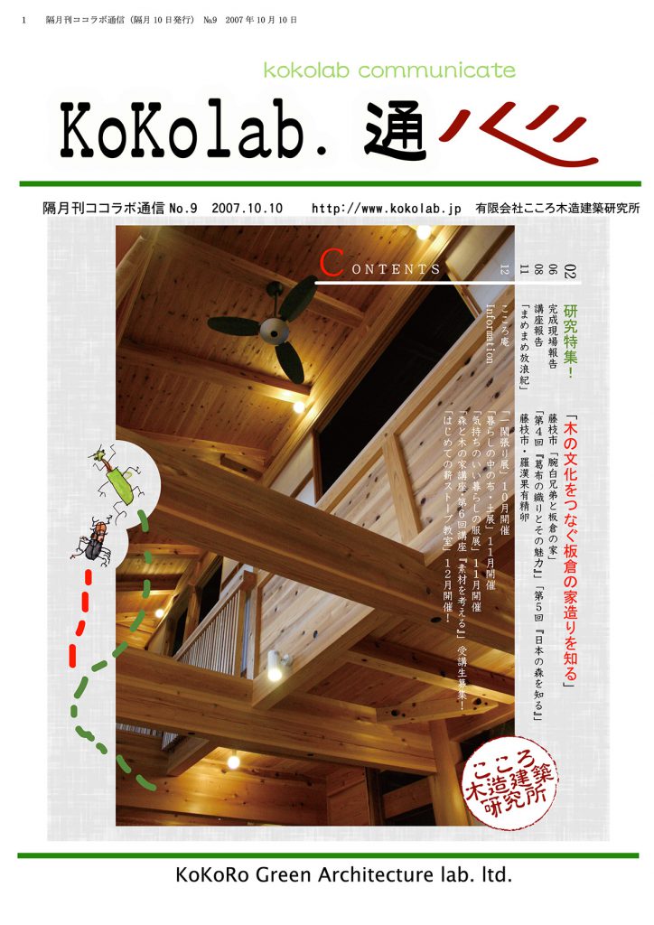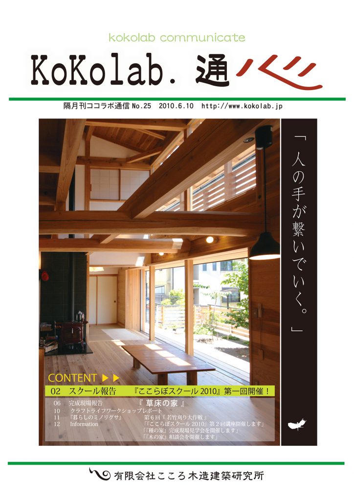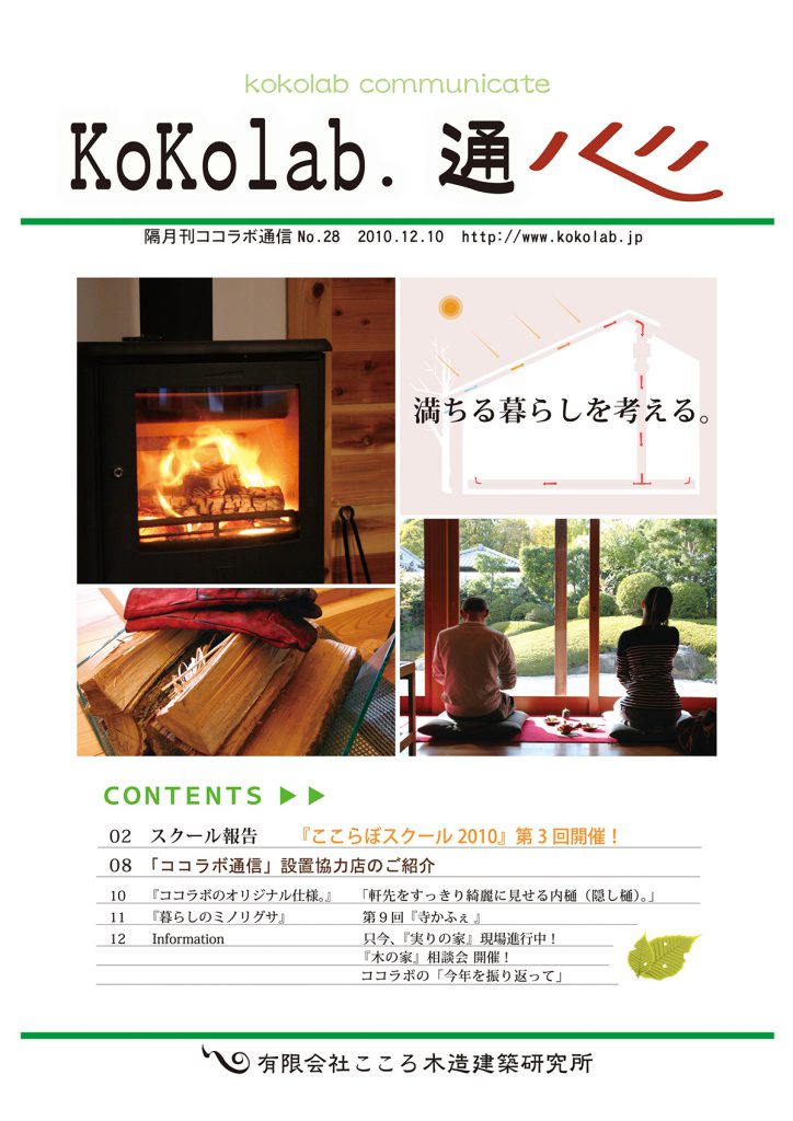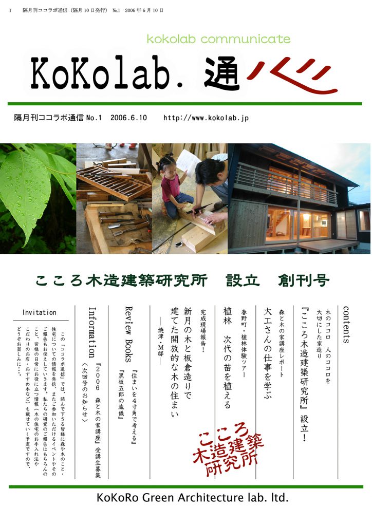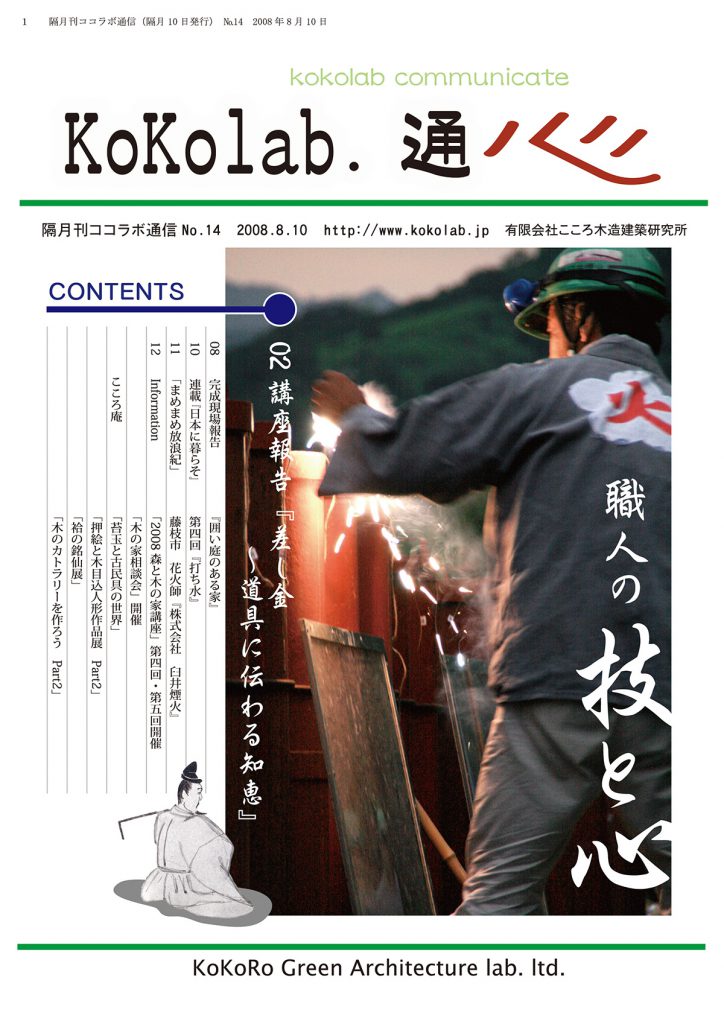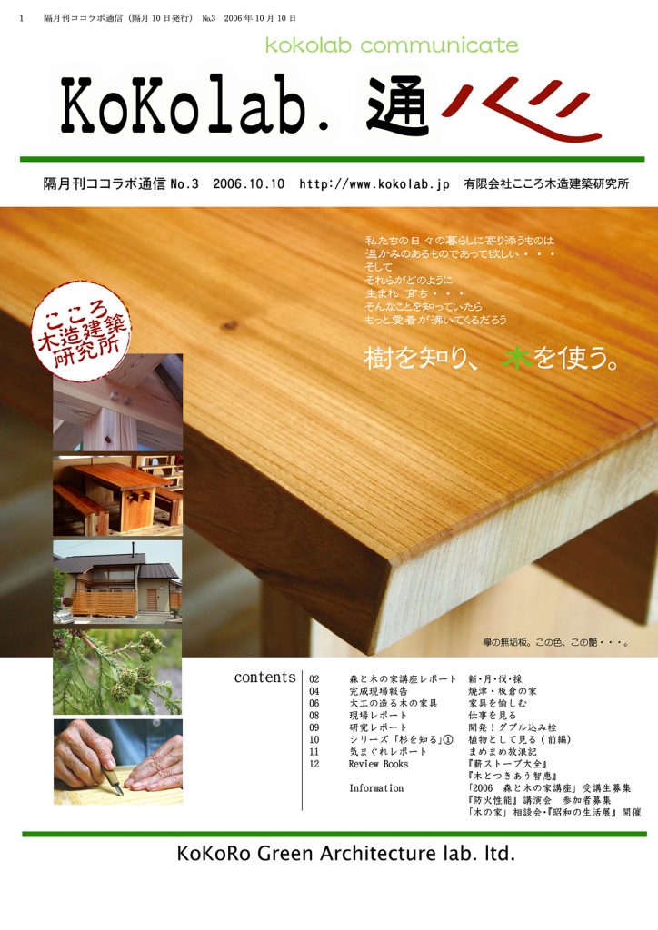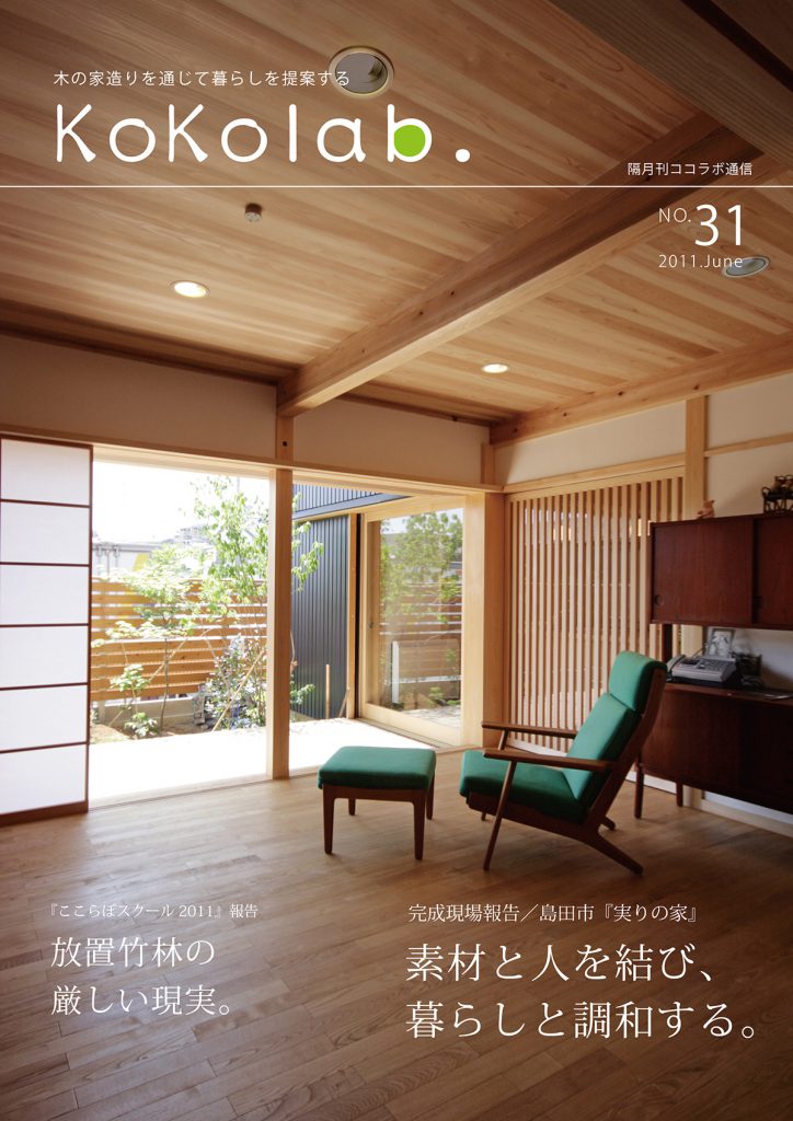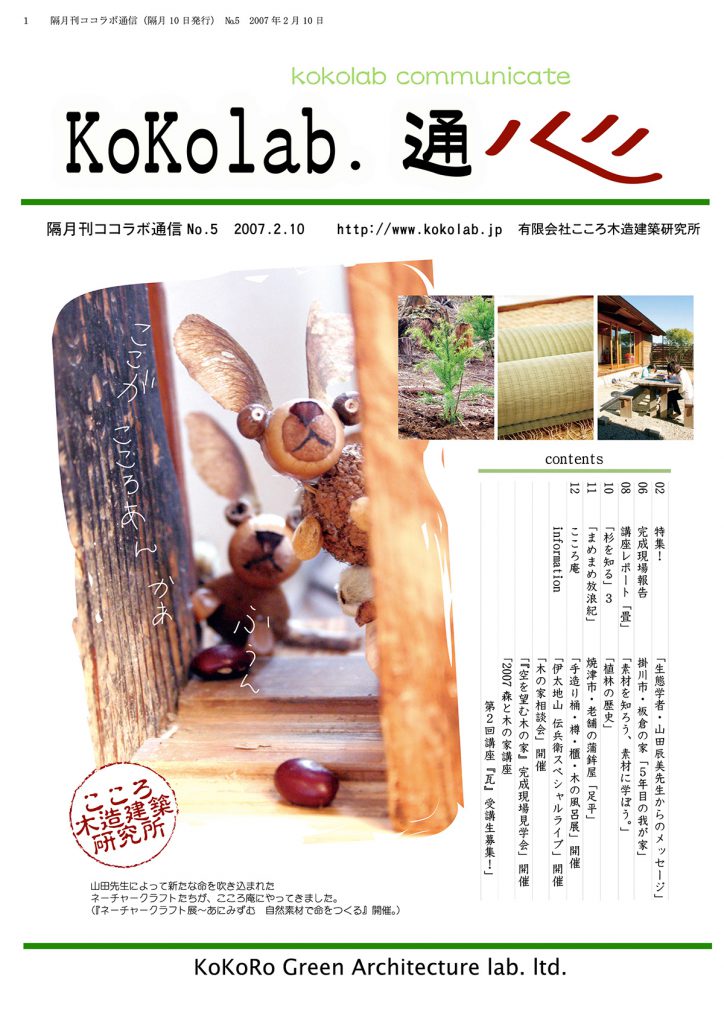 建築事例では、木の家を建築するまでの様子や、暮らし始めてからの体験、完成してから数年経過した木の家の変化などの実例をもとにご紹介し、こらから木の家を建てたいとお考えの方などにご好評をいただいています。また、こだわりのお店紹介では、おススメの商品紹介や、新しいイベント告知などをしています。ココラボ通信は、希望の方に定期的に郵送させていただいています。また、kokolab通信の設置店さんで無料配布しています。是非お手に取ってご覧ください。