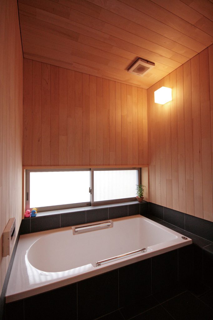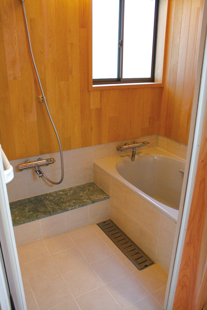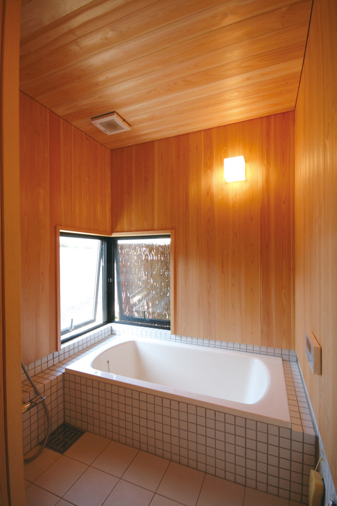 壁と天井にサワラの板が張られ、優しく暖かな印象の浴室です。