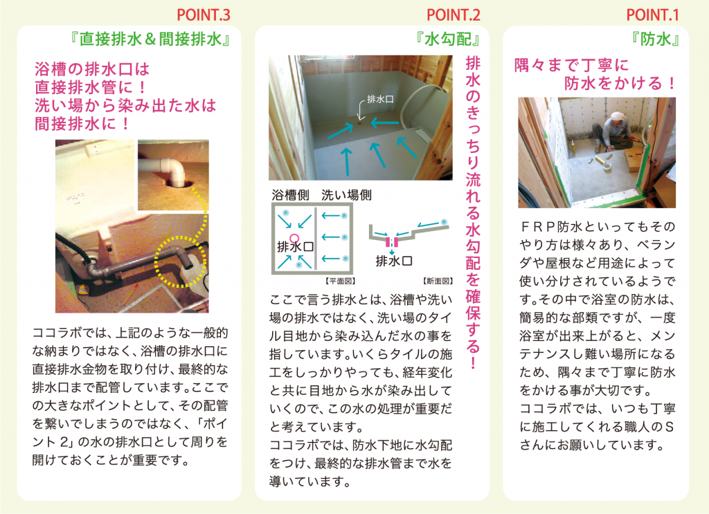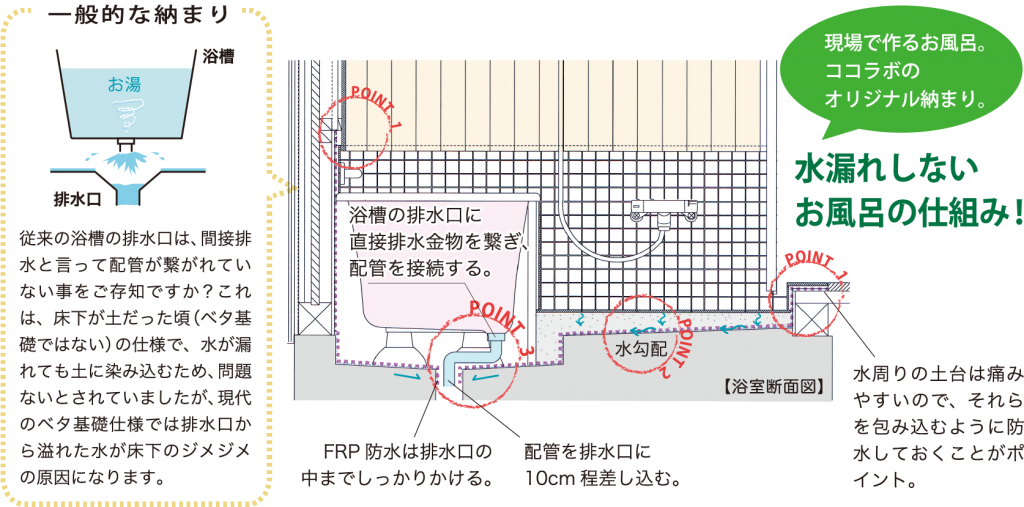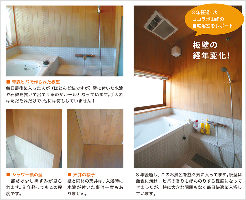 そこで、次ページでは、ココラボの行っている浴室の防水の仕組みと、壁や天井の木の経年変化をお伝えしたいと思います。