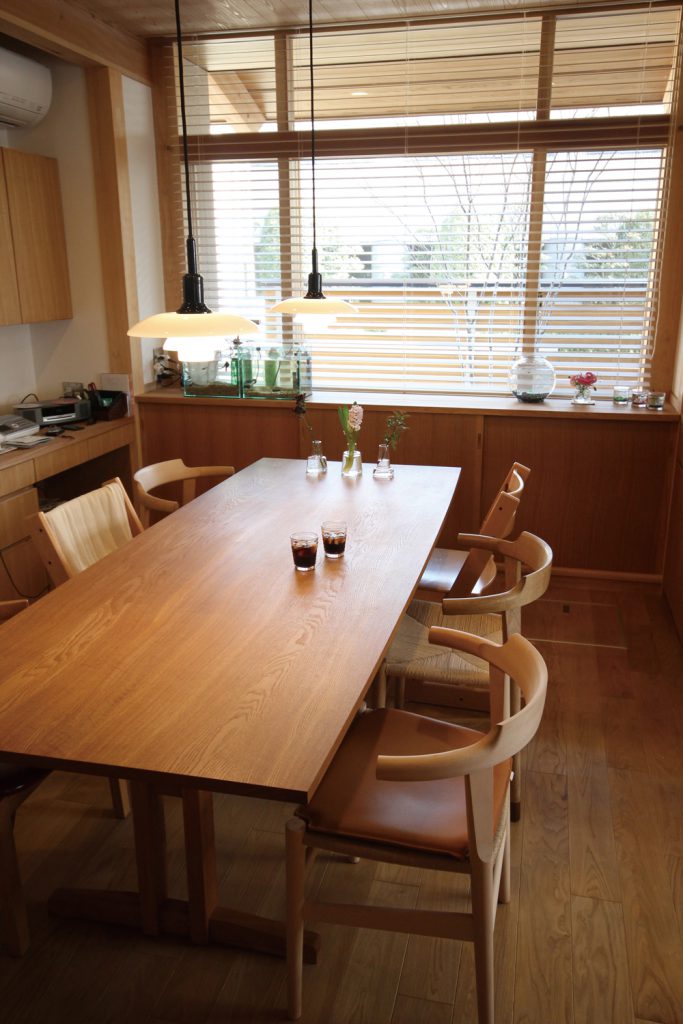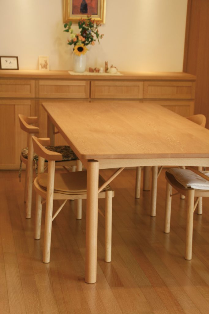 ダイニングテーブルは楢材の2枚ハギ板で天板をつくり、建具でもよく利用するタモ材で脚部を制作しました。建具の仕組みを使い、金物を使わずホゾと呼ばれる組み方でつくられています。